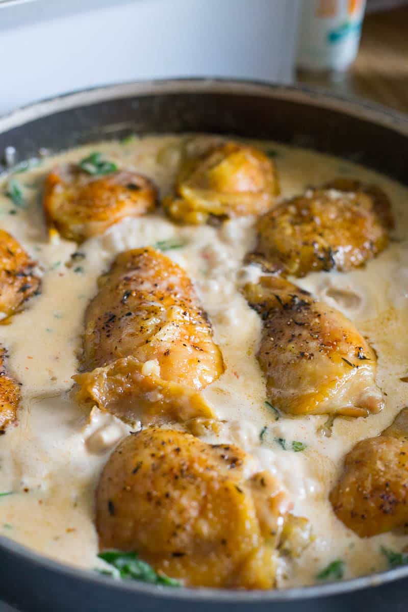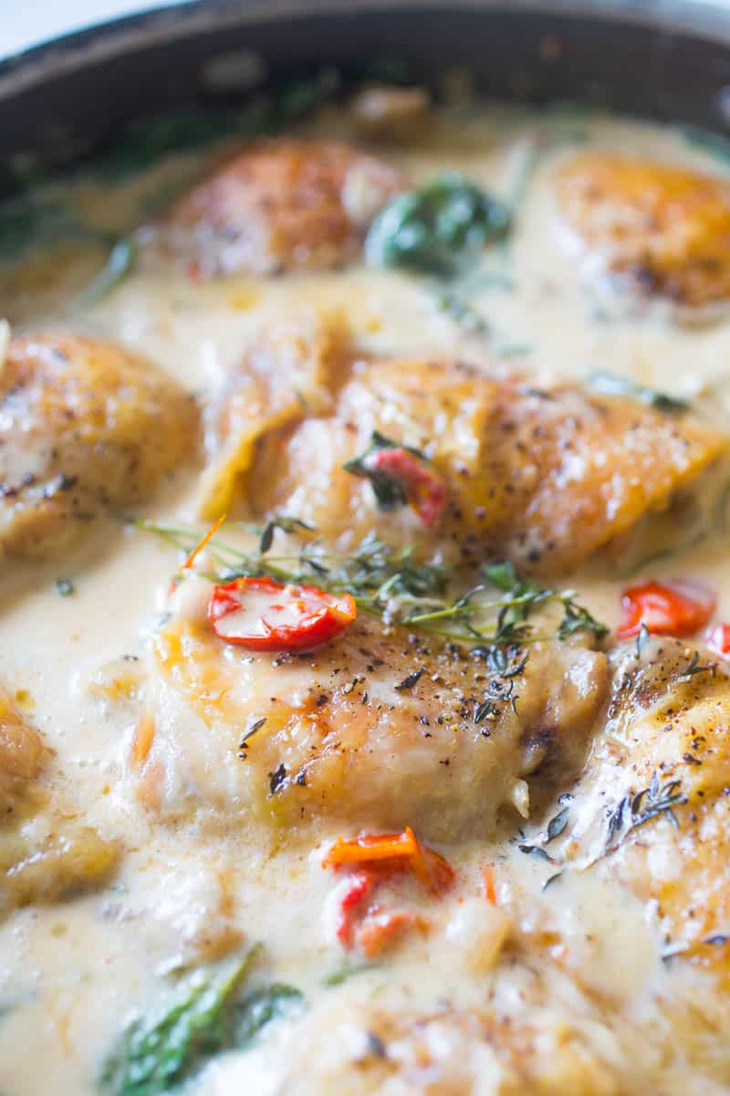 plate and leave the fat dripping in pan. With the heat from the burn turn on, add the diced onion in the skillet and cook in the fat drippings for 5-7 minutes until soft and translucent. Add the garlic and cook for 2-3 minutes. - Using a whisk and whisk in the heavy cream into the pan until the cream and drippings combine as a sauce. Add the cheese and whisk until completely melted. Add the sun-dried tomatoes and baby spinach and stir until spinach is wilted and cooked in the sauce. Return the chicken thighs back to the pan with sauce, squeeze the lemon juice over the thighs, and turn the heat down to a simmer heat and allow to cook in the sauce for 10 minutes before serving.