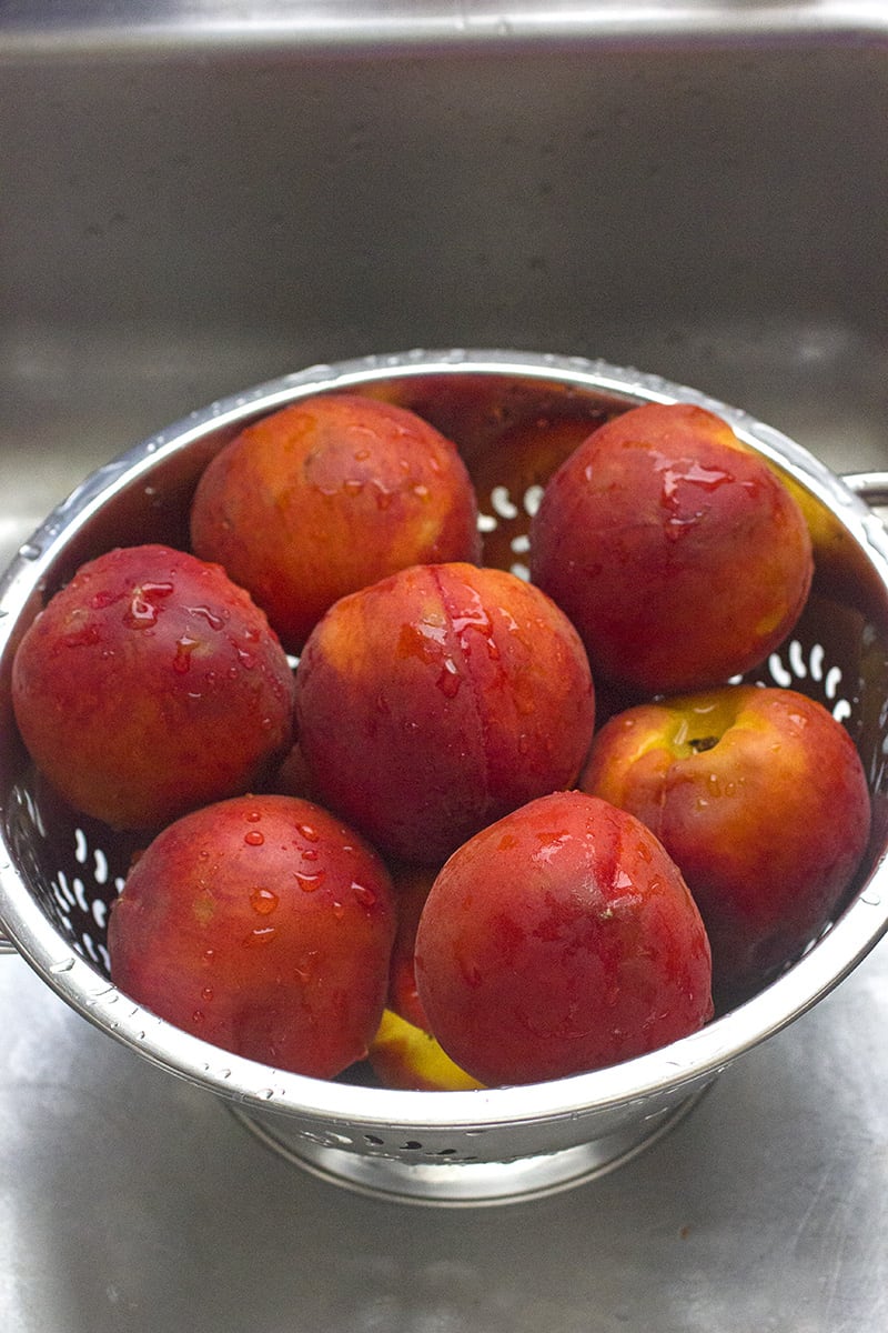 - Carefully peel the peaches with a paring knife. The more ripe the peaches are the easier it should be to peel the skin off with your fingers after the initial first slit. Once the peaches have been peeled, slice the peaches into long slices and discard the pit. Turn the sliced peaches to a bowl.