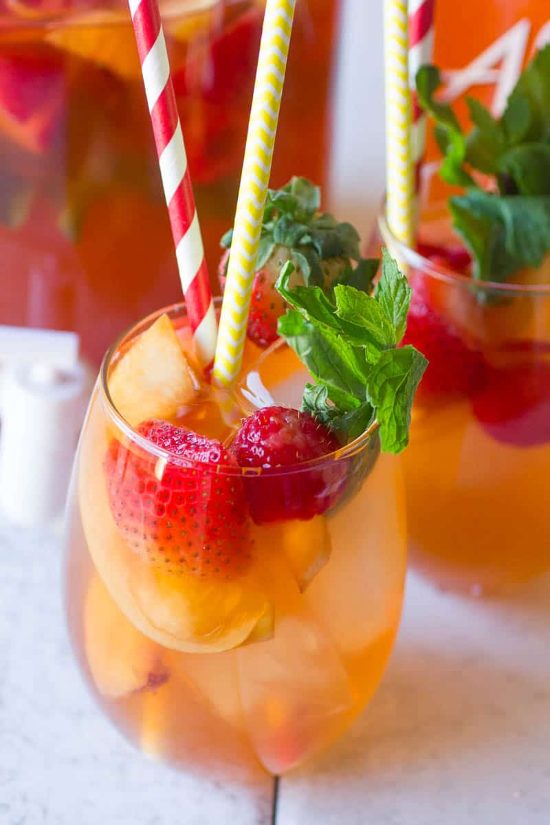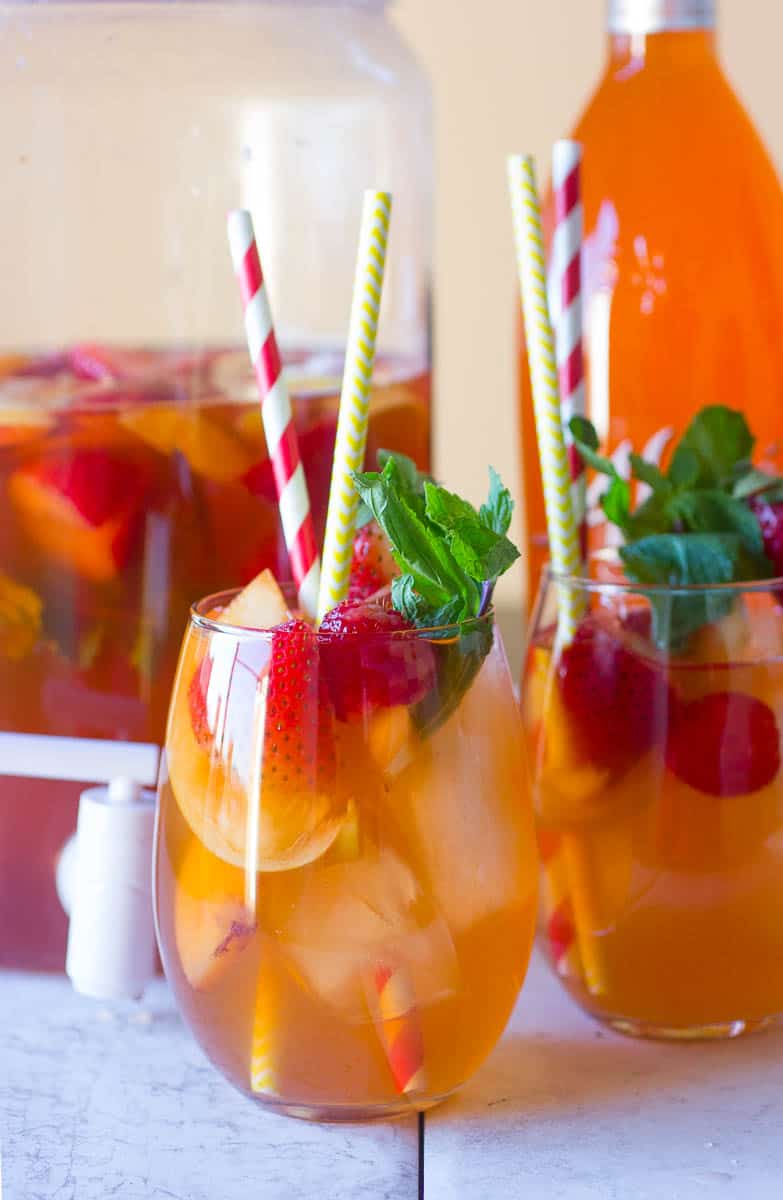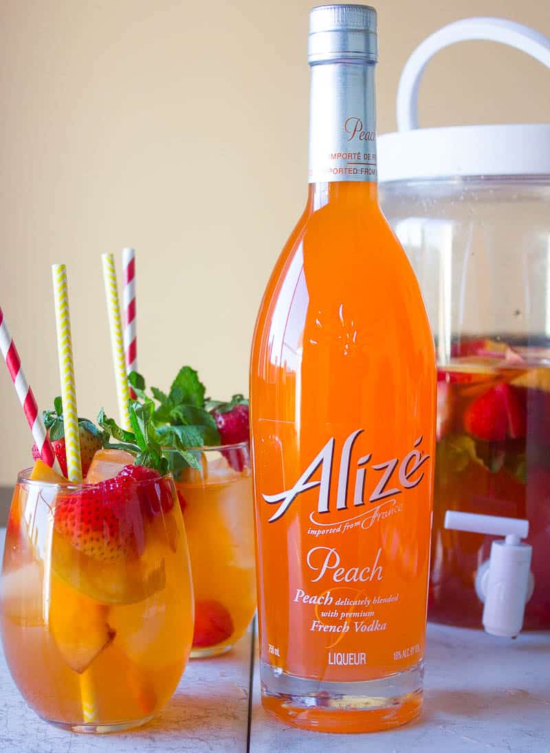- In a 2-gallon pitcher, pour in the peach cocktail, tea, Alize Peach Vodka, and mix. Add the peaches, strawberries, raspberries, and mint. Add 4 cups of ice. Allow to sit in the refrigerator for, at least, 4 hours or longer before serving.