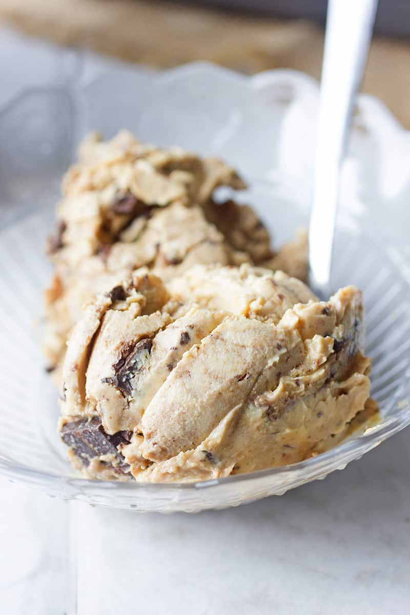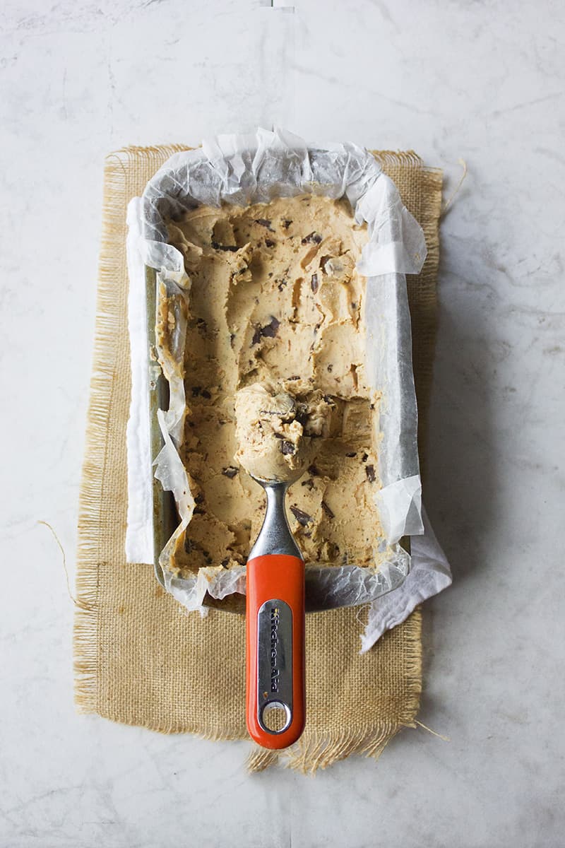 This Peanut Butter Frozen Yogurt with Dark Chocolate is made with pure peanut butter and chopped full of 70% Dark Chocolate bits.
