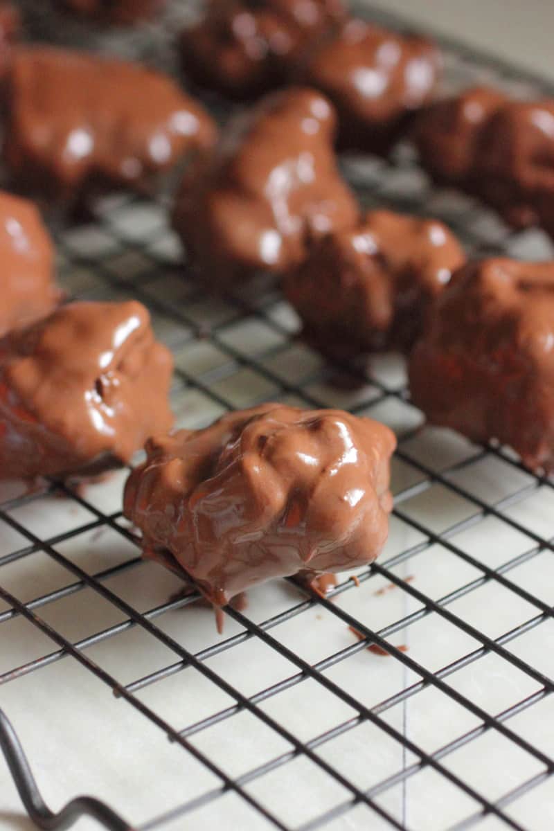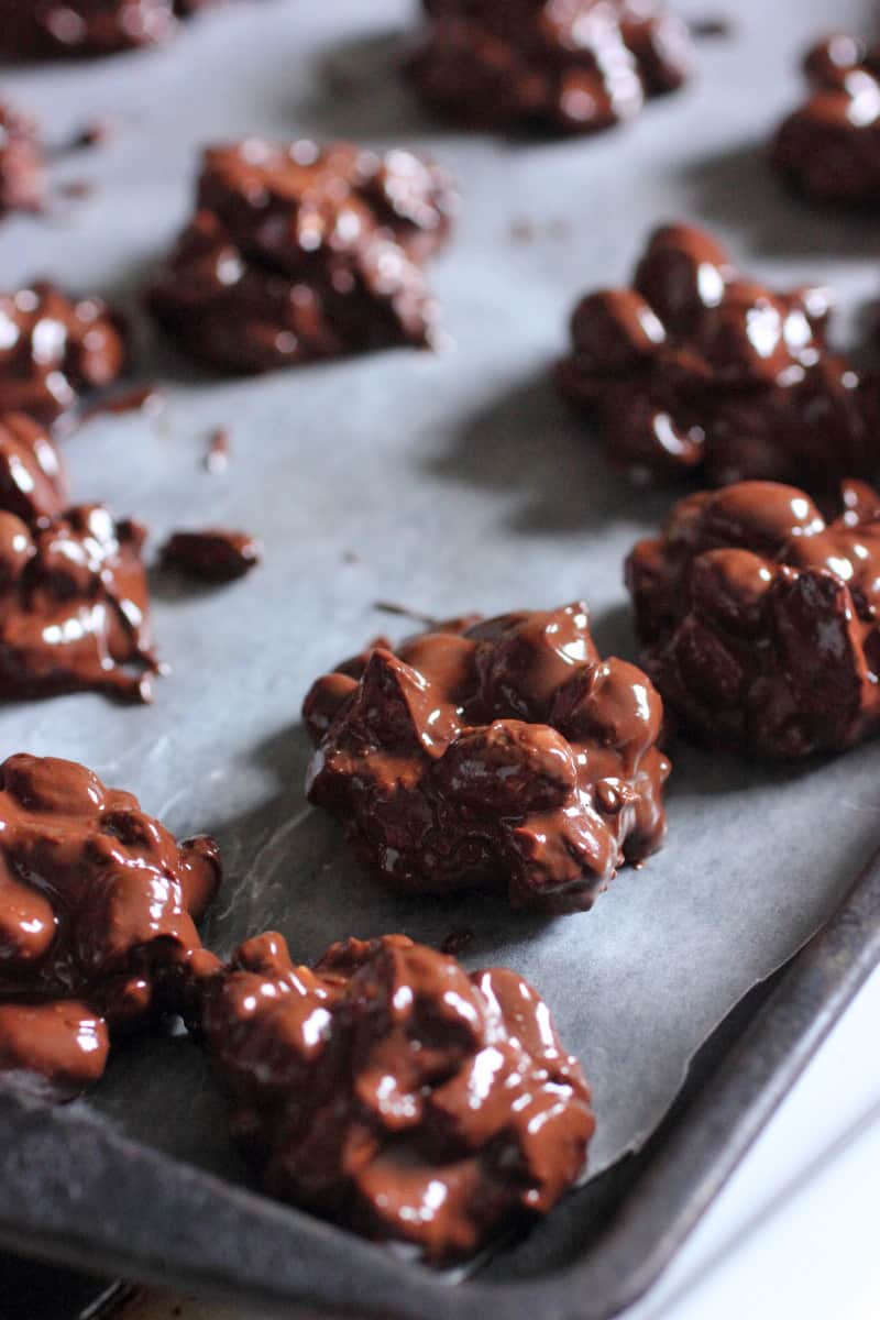 Let’s see, where do I begin. How about I talk about my slight crazed addiction to all things chocolate. Well, just about everything chocolate. I don’t like chocolate-covered bacon or chocolate covered raisins. That is neither here nor there. Do you know what I love the most about chocolate? How thick it is and how it completely covers the inside of your mouth hand you need cold milk to wash it down. Y’all know what I’m talking about. The same thing happens when you eat a warm chocolate chip cookie and your mouth is all gooey and stuff. Â I love that effect! It brings my mouth such joy! These chocolate clusters leave you wanting more. In fact, I had to make sure that I had my significant other take them to work with him so I didn’t eat more than what I did.