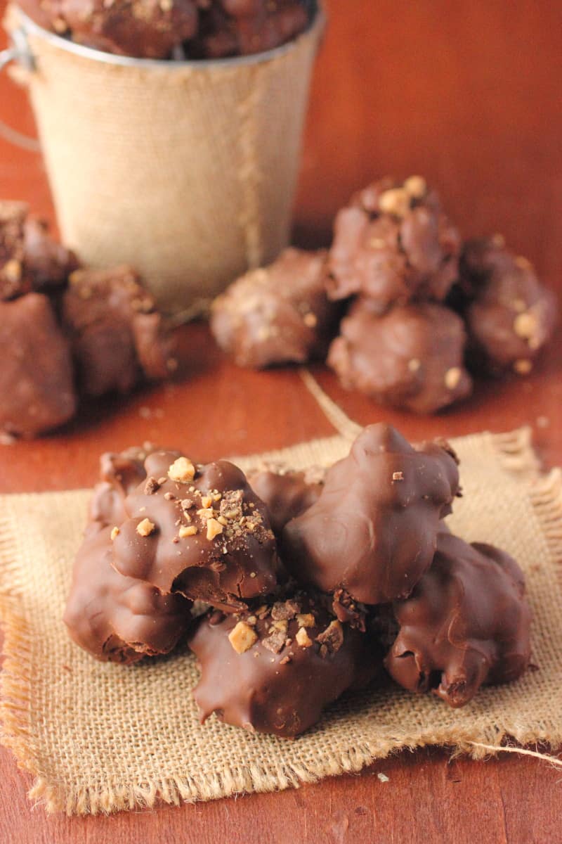 If you are looking for a snack or an option to give away as a gift, these Peanut Toffee Chocolate Clusters are a great option. Made with rich chocolate, peanuts, and toffee you will make these every chance you get!