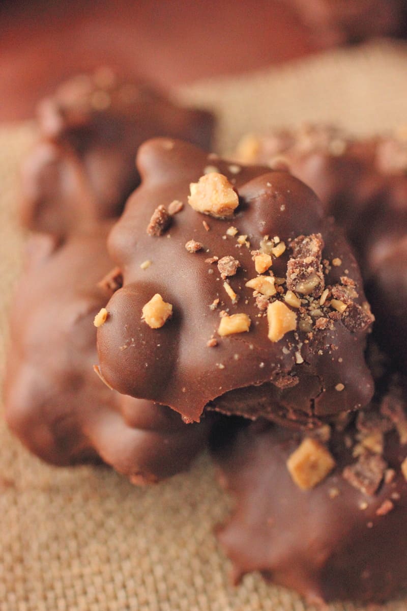 - Meanwhile, melt the chocolate candy coating and take each cluster, and dip inside the melted chocolate with a fork. Shake off excess chocolate and turn back to wax paper or a silicone mat. You can sprinkle extra toffee on top if you want or leave plain. Place back in the fridge for another 15 minutes to let set and serve or place in an air-tight container.