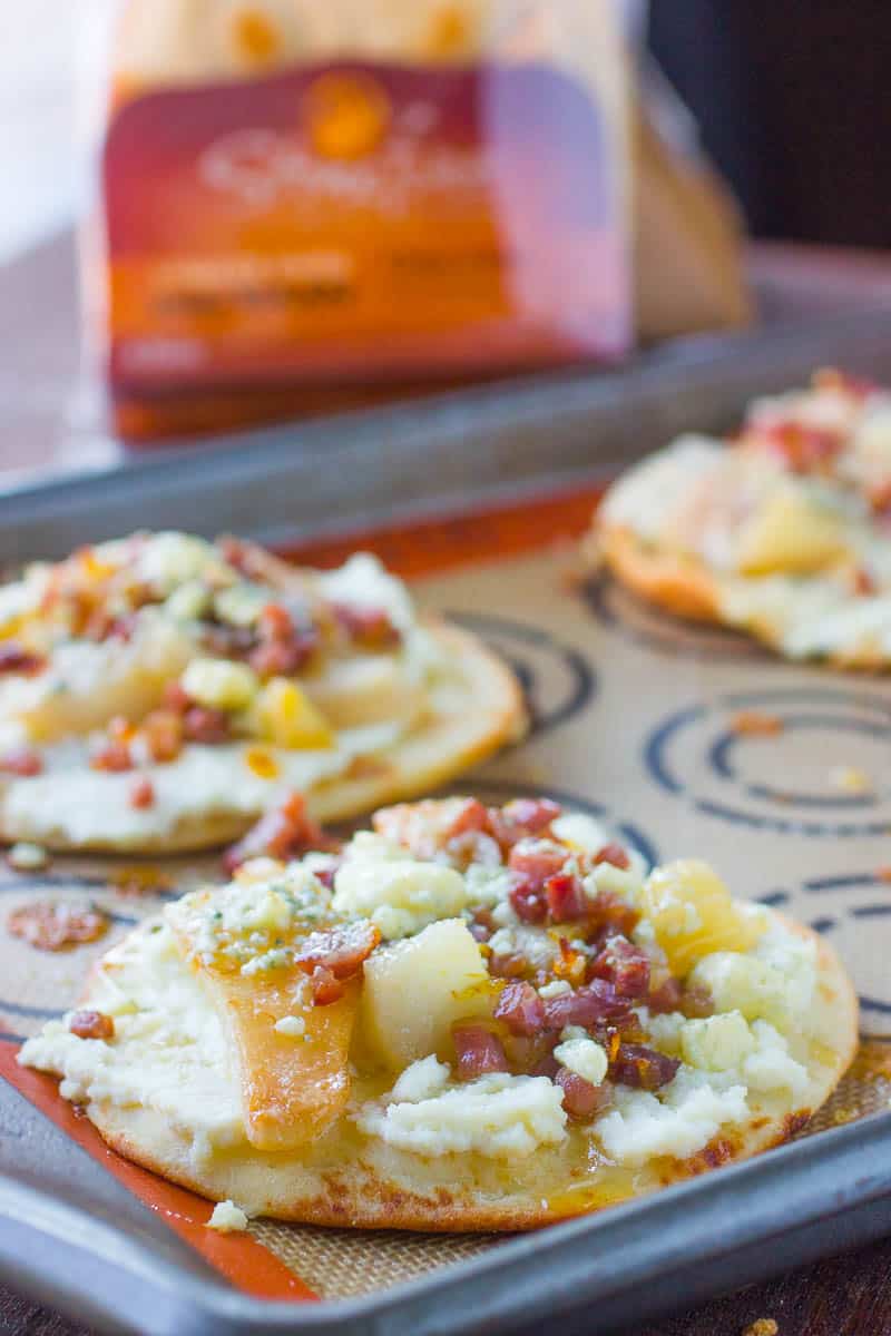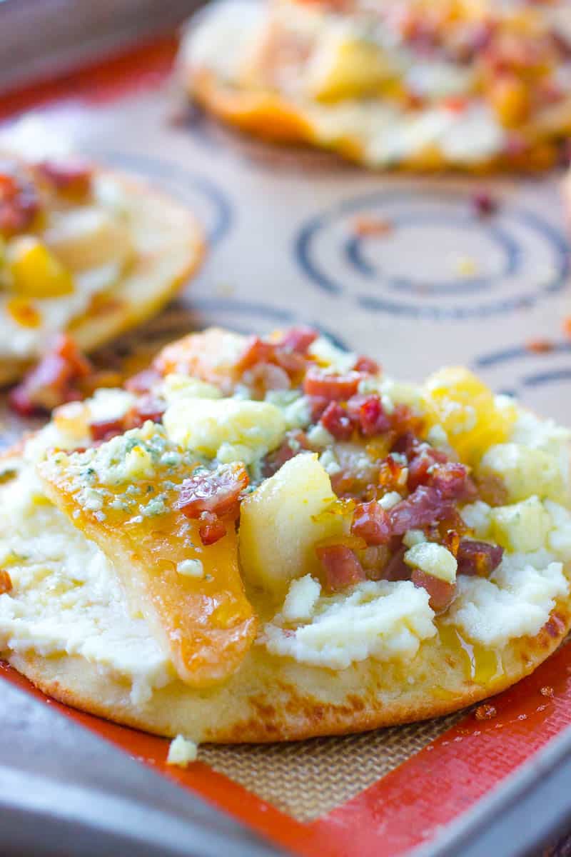 - Line a baking sheet with parchment paper or a silicone mat. Place Stonefire’s Mini Naan on the baking sheet. Take 2 spoonfuls of the ricotta cheese and spread evenly on the flatbread. Sprinkle with the prosciutto mixture and sauted pears evenly amongst all the flatbreads. Top off with Gorgonzola Cheese and place in the oven for 10 minutes. Once the pizzas are done, drizzle with honey. Serve whole or cut into triangles.