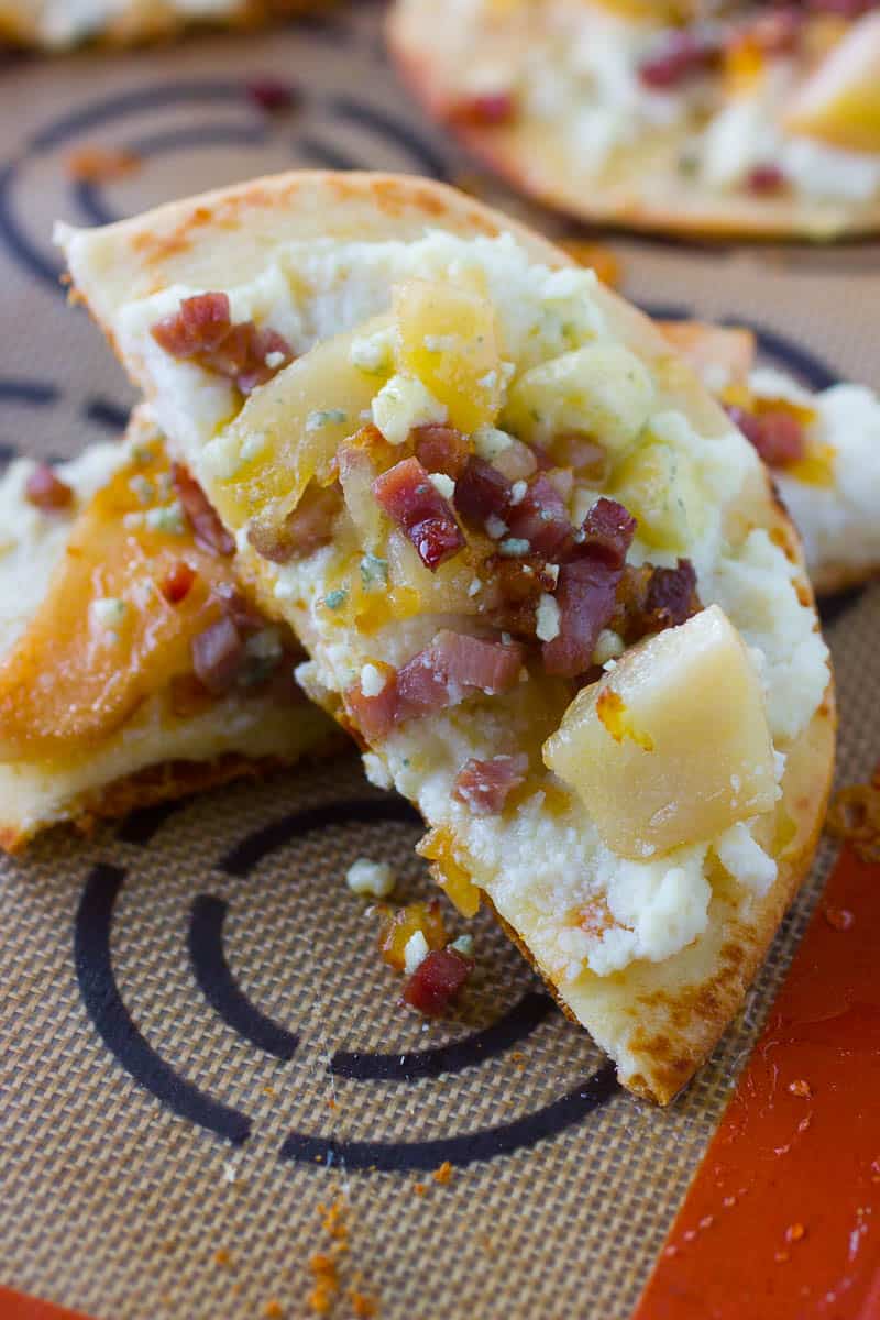 With this recipe, I wanted to create something that would stretch my taste palette just a bit. No this is not complex in terms of taste pairings, but for me it does stretch my cooking abilities a bit. I knew I wanted to make some sort of pizza, but I didn’t want to make a regular pizza with sauce, cheese, and pepperoni. That idea is kind of like “duh”. Then I thought, why not make an Indian Inspired Pizza. The more I thought about it I didn’t want to go in that direction as I am not adept to working with Indian flavors and ingredients. Somewhere in the madness of my mind making something sweet and salty with ricotta cheese just made sense to me. With that idea in mind, I give you Prosciutto and Pear Flatbread Pizzas! You can eat these for yourself or make them and cut them into cute triangles to serve at your next holiday party. The choice is yours. Either way you won’t be disappointed.