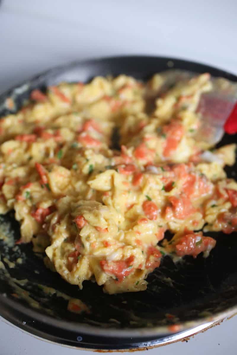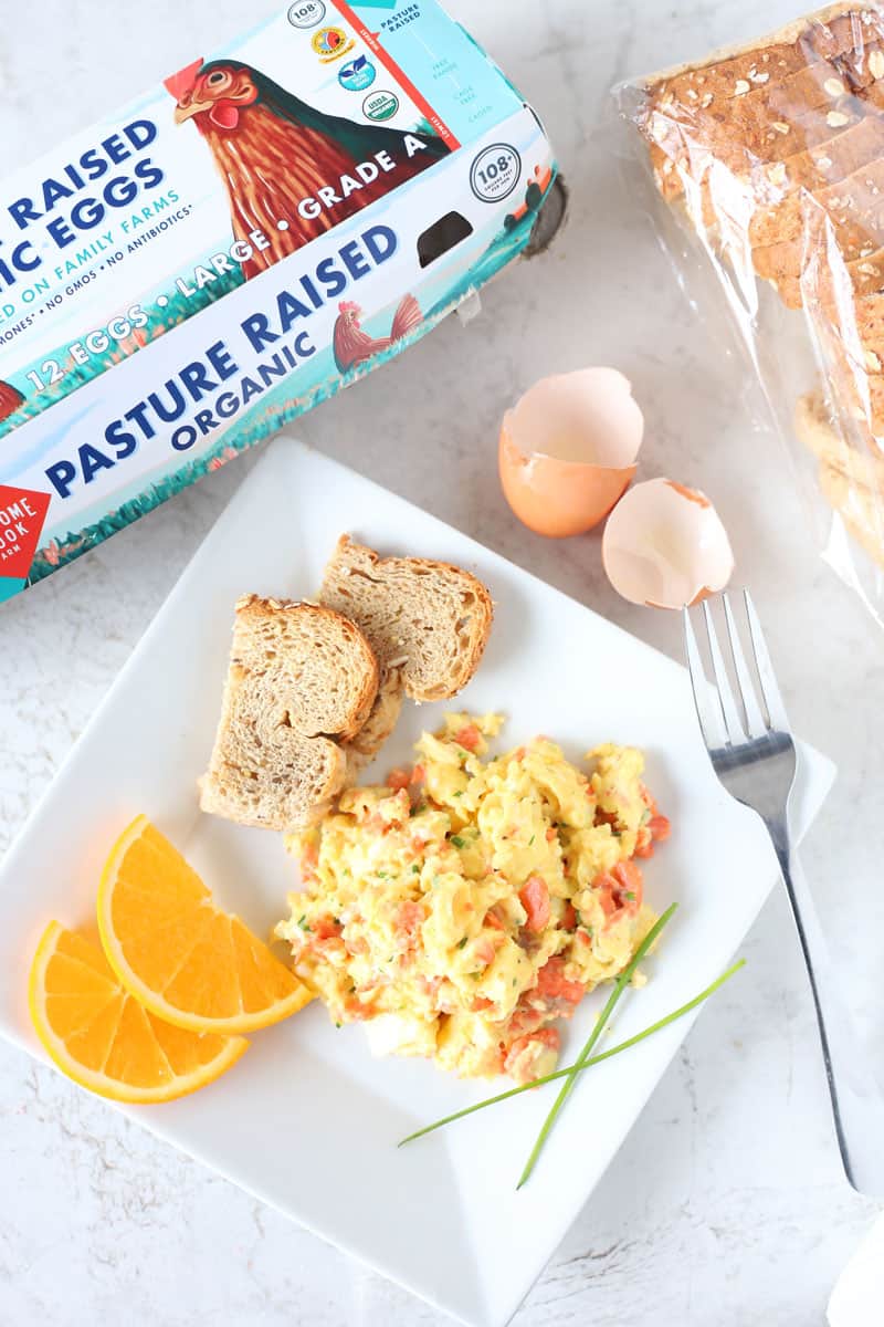 These are perfect scrambled eggs made with Smoked Salmon and Chives to add protein and flavor made using Brook Handsome Farm Pasture Raised Eggs.