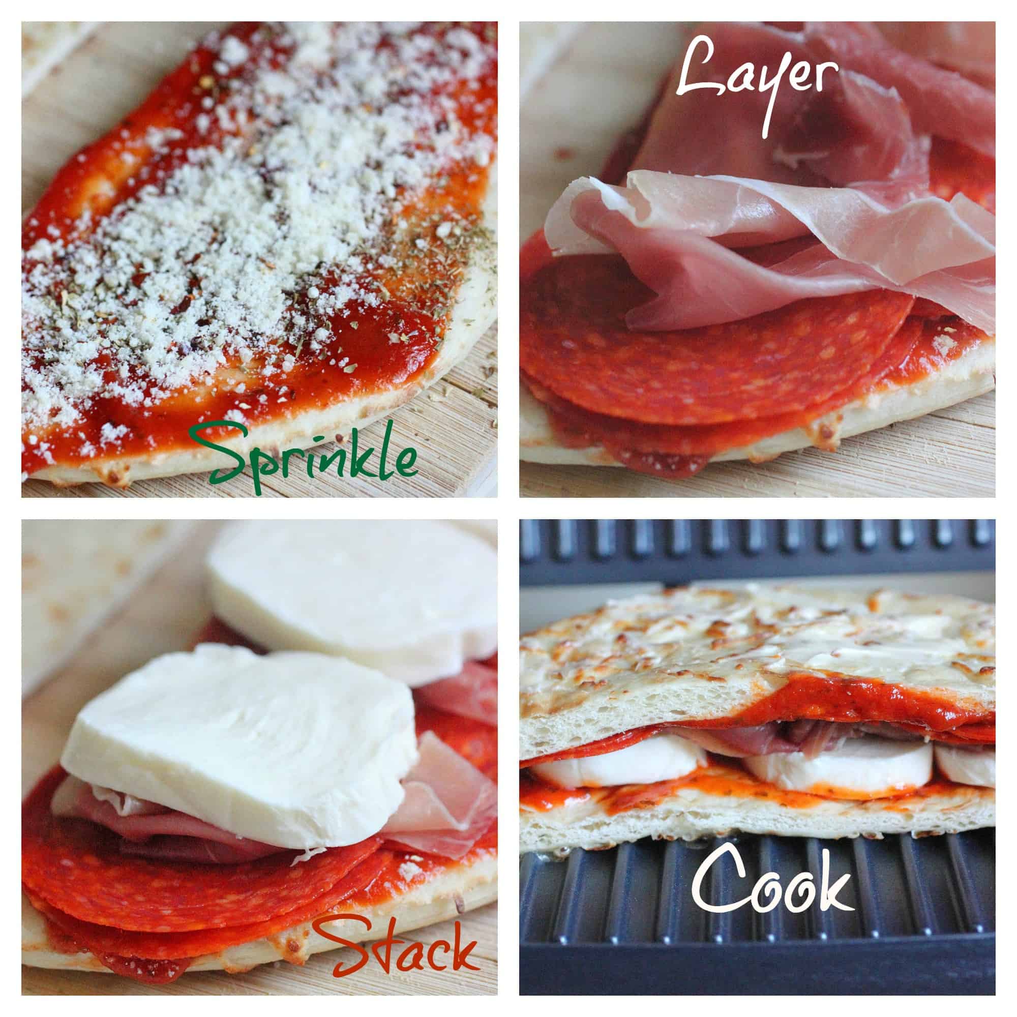 - Brush the outer side of the pizza crust with olive oil. Cut the pizza crust in half. Spread the pizza sauce on one of the pieces of pizza crust, sprinkle the Parmesan cheese, oregano, and crushed pepper; layer with pepperoni, prosciutto, and mozzarella cheese. Take the other half of the crust and place on top. Place the Panini onto the Panini maker and cook on each side for 3 minutes. Once cooked, cut into half again and serve.