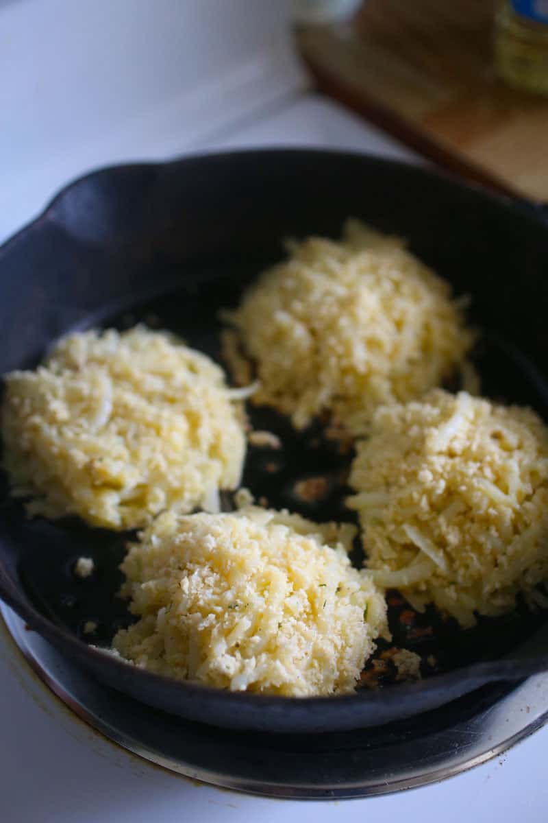 - In a medium sized shallow heavy skillet, heat the oil on medium high heat. Pour the panko bread crumbs in a plate. Take about ½ cup of the potato mixture and form into a patty form, coat with panko bread crumbs on both sides. If it seems to fall apart don’t worry because it will stick together once they cook. Place in the pan and cook on both sides for 5-7 minutes until crisp and golden. Flip and cook on the other side. Place on plate lined with paper towels.