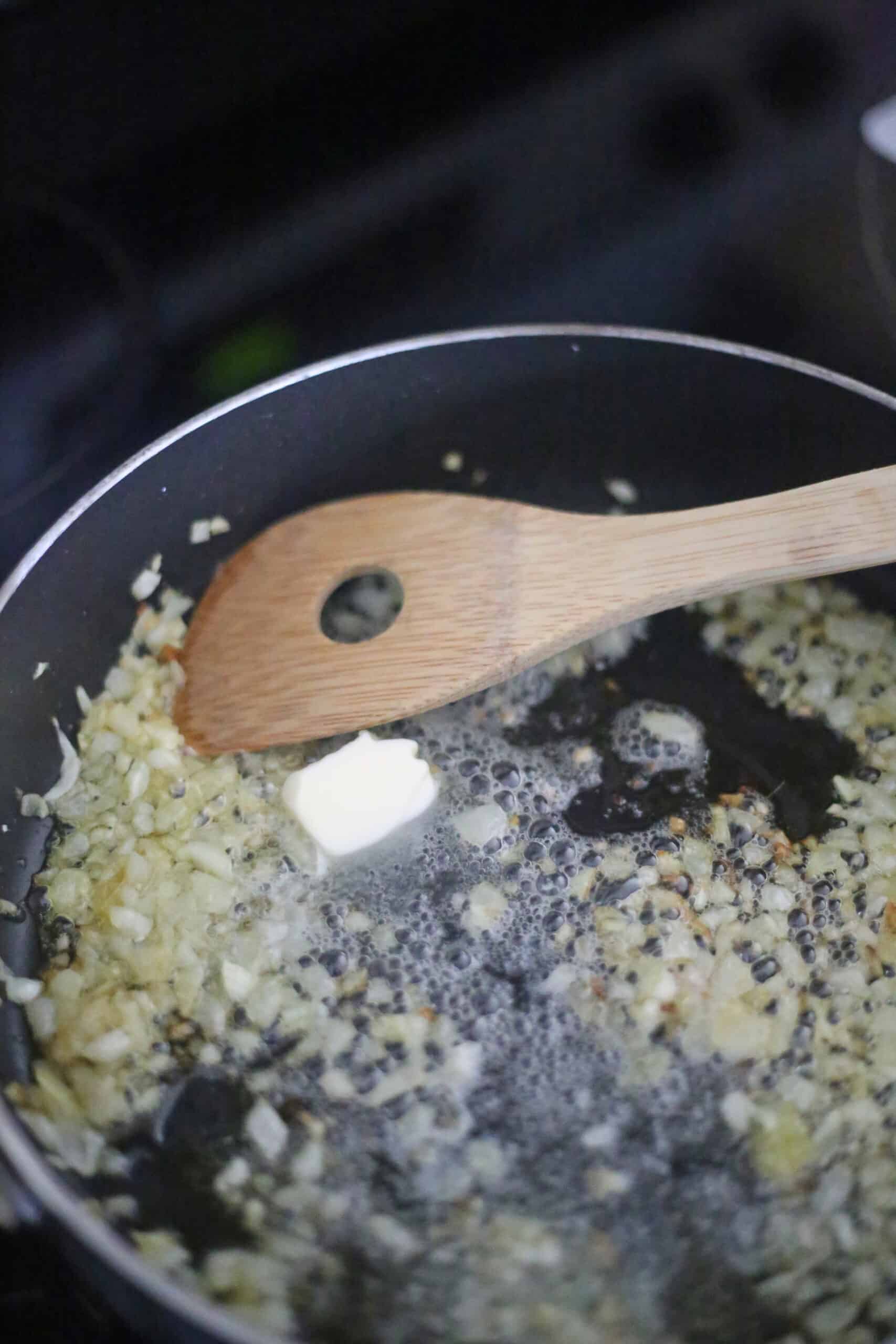 - In a large shallow saute pan on medium heat, heat the olive oil and add the onions. Cook the onions for 5-7 minutes to allow them to soften. Add the garlic and cook for 2 minutes.