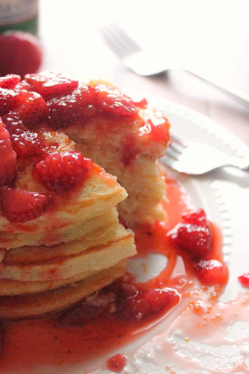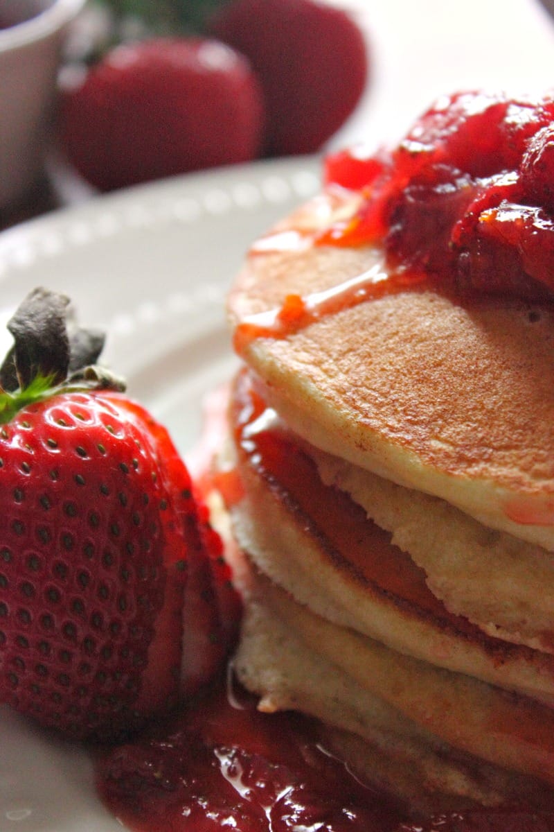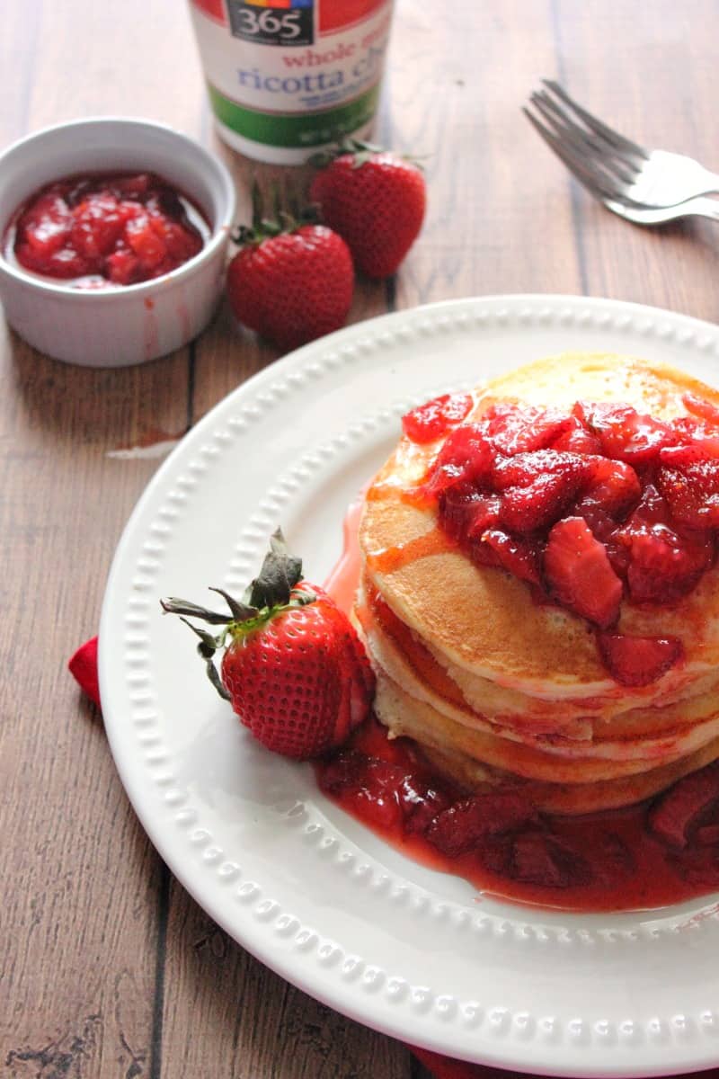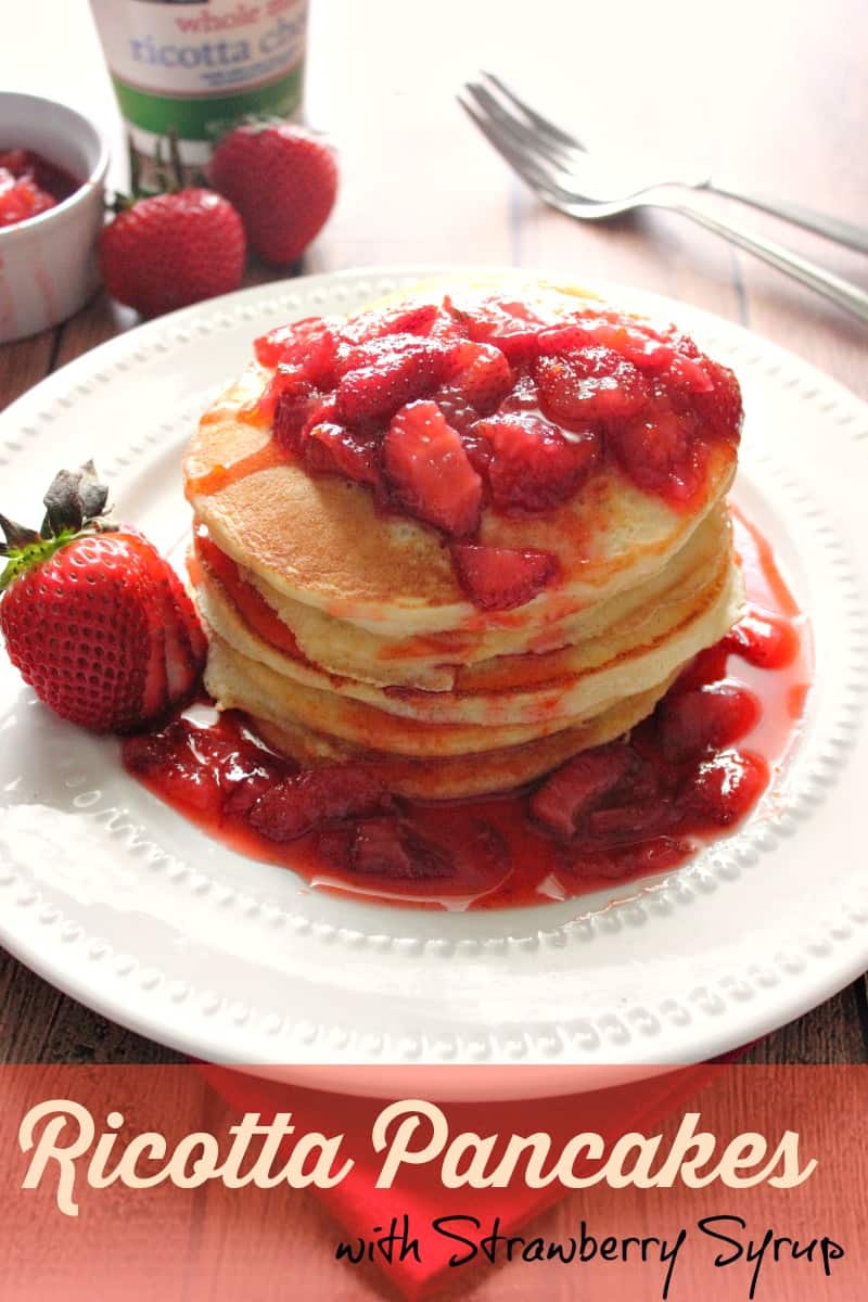 Ricotta cheese is very light with mild flavor.If your worried, you can’t taste the ricotta at all. What it does is make the pancakes incredibly moist and fluffy.When I tried them, they tasted like little pillows of heaven. Adding strawberry syrup to the top of the pancakes just made the entire dish delectable and grandeur. I mean…LOOK AT THEM!