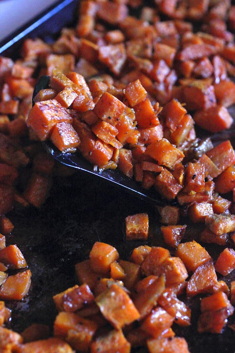 - Turn the diced sweet potatoes to a large bowl and toss in canola oil, maple syrup, salt, pepper, and smoked paprika. Spread the diced potatoes out onto the baking sheet and roast for 25-30 minutes.