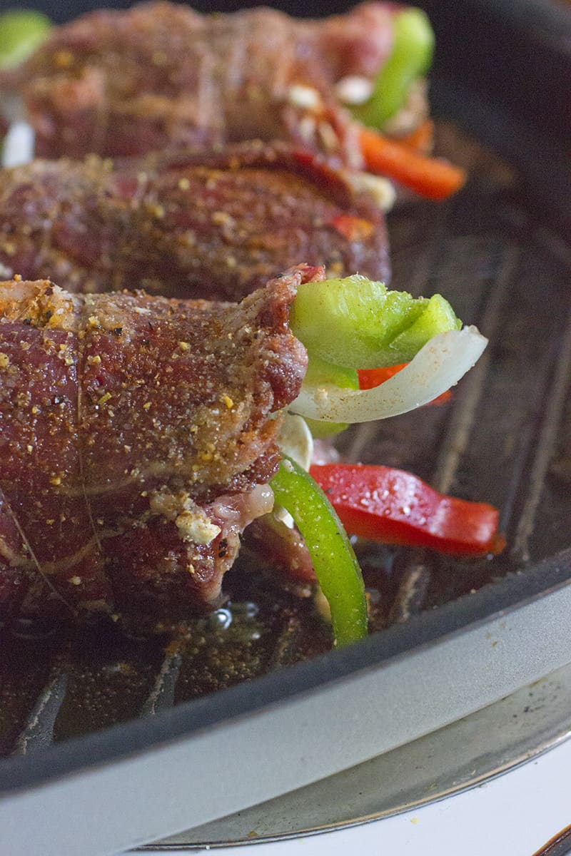 - Heat a grill pan on medium heat with 2 tbsp. Olive oil. Place 3 roll ups in the pan at a time, or as many as you can fit comfortably, and cook on each side for 5 minutes until each side is nicely seared. Remove the 3 roll ups and cook the remaining roll ups in the pan the same way.