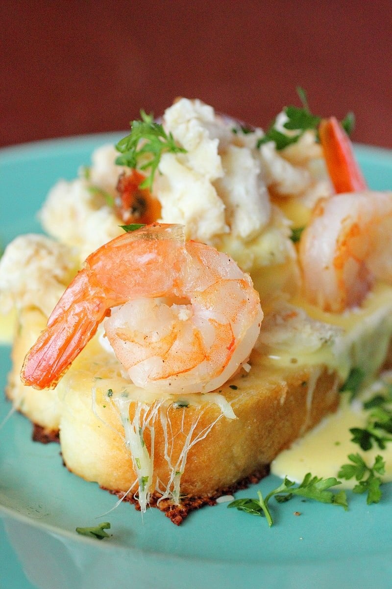 I wanted to come up with something that would take the classic Eggs Benedict dish and take it up a few knotches. Instead of using an English Muffin, I decided to use Garlic Texas Toast and I used lump crab meat and juicy pieces of shrimp and let me tell you it came out amazing! When I first came up with this rendition of Eggs Benedict, my husband must have eaten 2 servings, at least. Our first vacation we went to New Orleans and at this awesome cafe for breakfast ( I can’t not remember the name). One of the dishes he ordered was a Seafood Eggs Benedict and we both fell in love with it! Yep, I think this is the dish that made my husband propose to me.