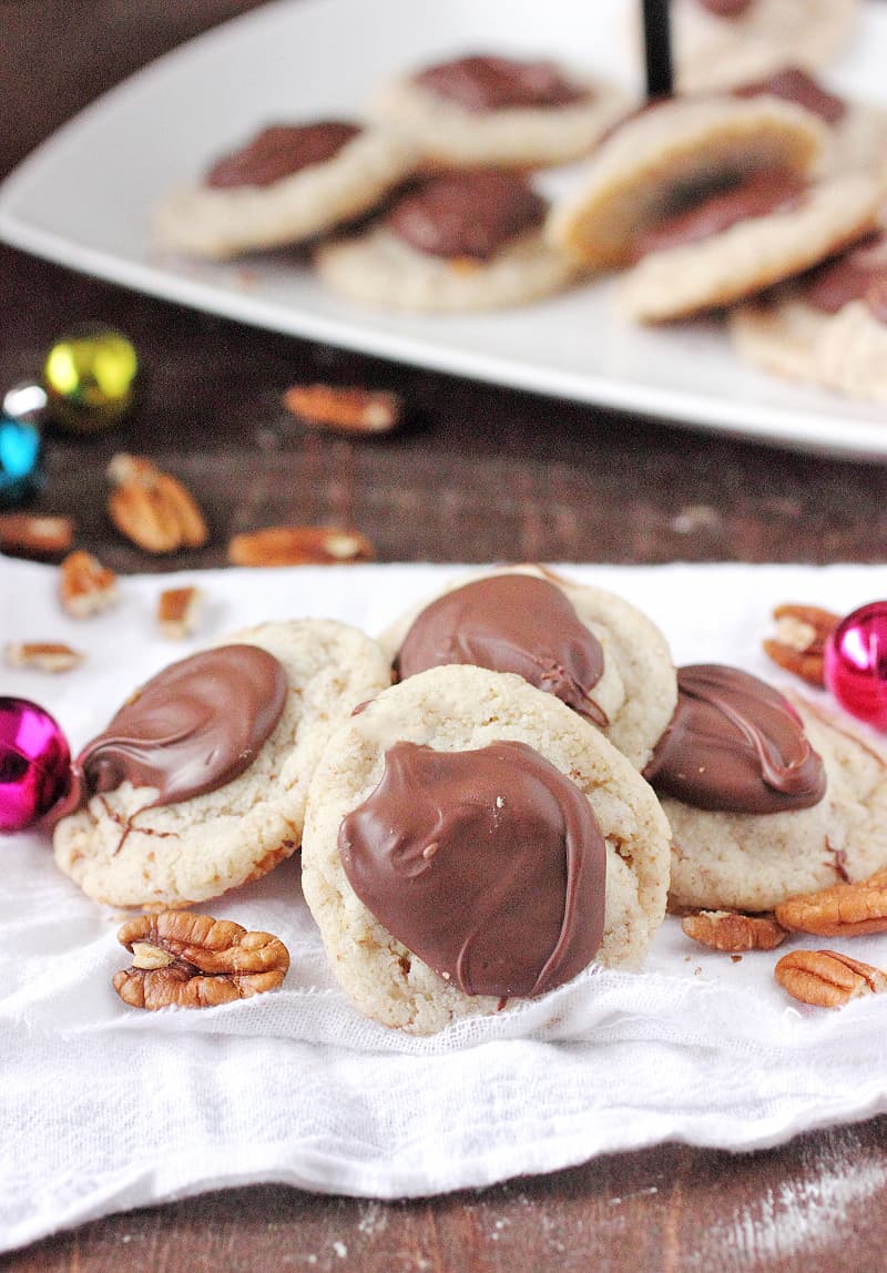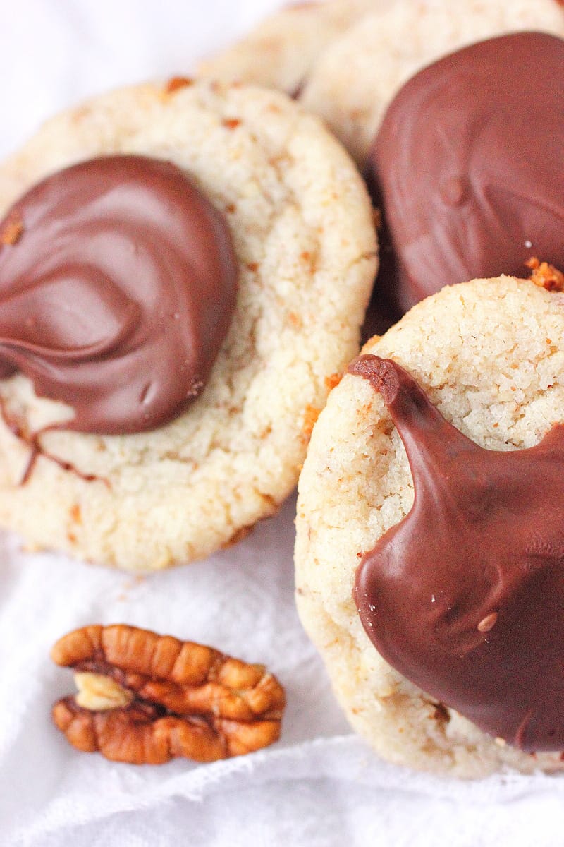 Anyway, I think you may have heard me talk about how much I love shortbread cookies in earlier posts. I really think Buttery Shortbread Cookies are my favorite cookies. I love it when they are soft, buttery, and slightly nutty. I guess that makes sense about why I love these Shortbread Pecan Cookies so much. Now, for those of you who may be a little funny about nuts being in your sweets, let me assure you that once you bite into these cookies, you won’t bite into huge pieces of pecans. The pecans are ground almost into a flour and is added into the cookie batter giving the cookies the nutty flavor they have. To make the cookies a little special, I added a little dollop of chocolate in the middle. You can drizzle of dip the cookies halfway. However you want to do it, but you will love the chocolate on the cookies regardless. If you are a big fan of Shortbread Cookies like me, you will love these Shortbread Pecan Cookies. They are perfect for any cookie exchange and everyone will love them. Just make sure they like nuts first.