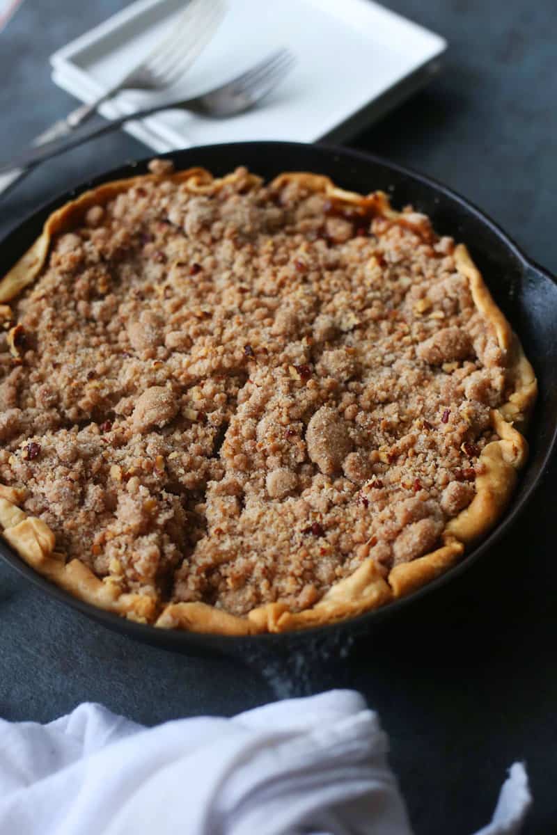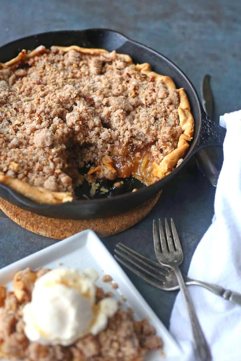 Make-Ahead: You can assemble this entire cast iron Dutch apple pie (filling in crust, topped with crumbs, ready to bake) and refrigerate it covered for up to 24 hours. When ready to bake, let it sit at room temperature for 15 minutes, then bake as directed. You may need to add 5-10 minutes to the baking time.