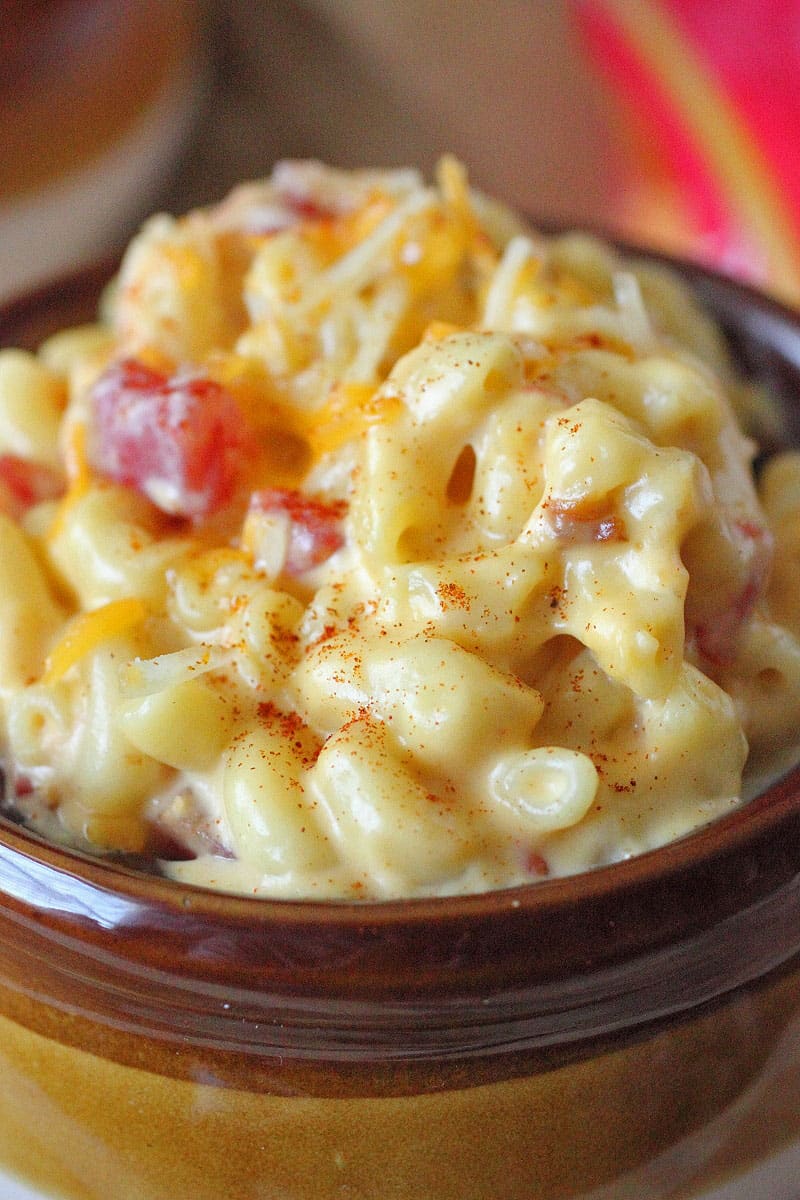 What I love more about this recipe are the diced tomatoes and green chilies. Adding this ingredient gives this mac-n-cheese a different flavor that you will enjoy. Adding this ingredient has me thinking that it would be such a good idea to add different toppings and ingredients to make the mac-n-cheese yours!