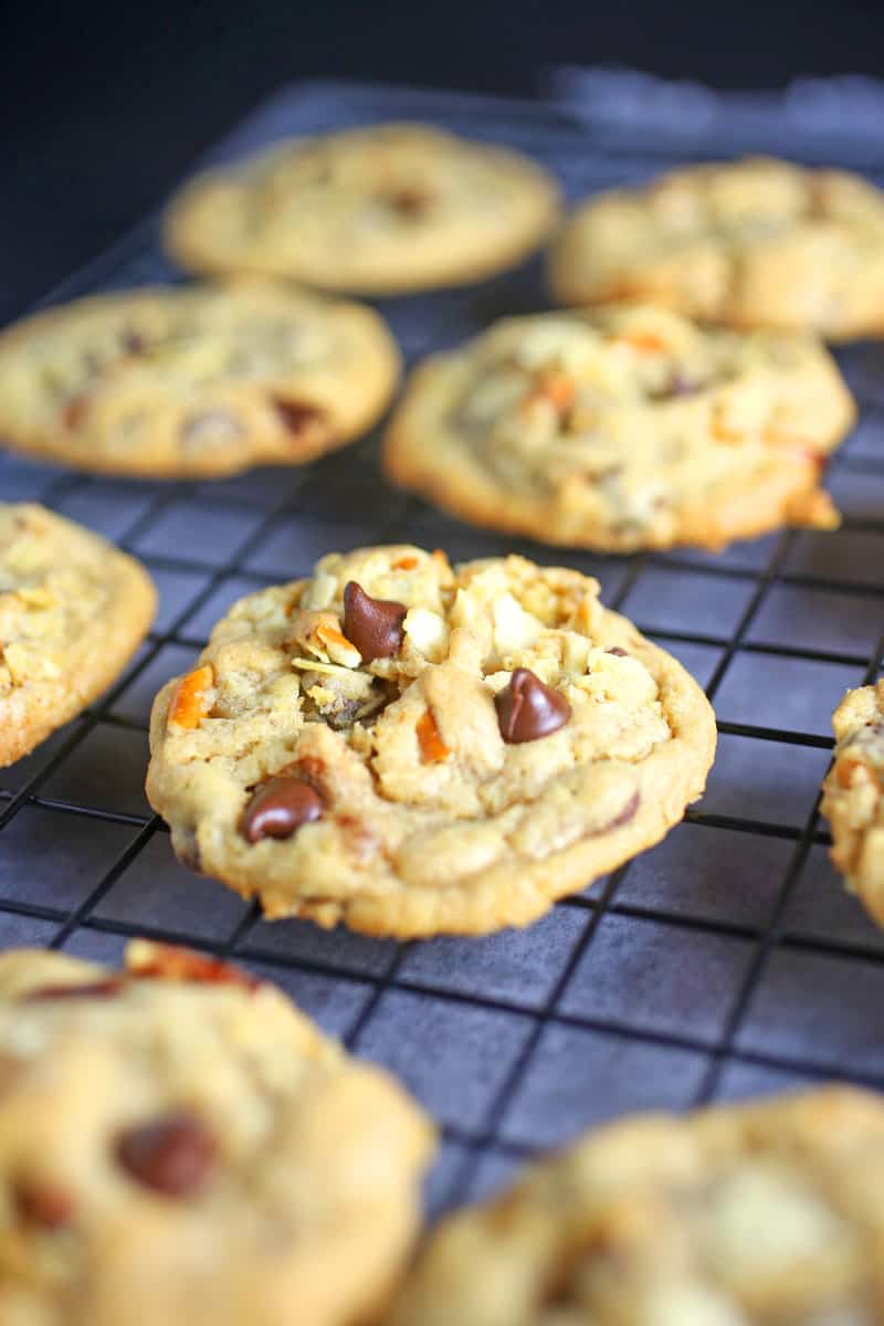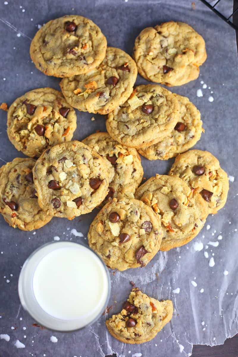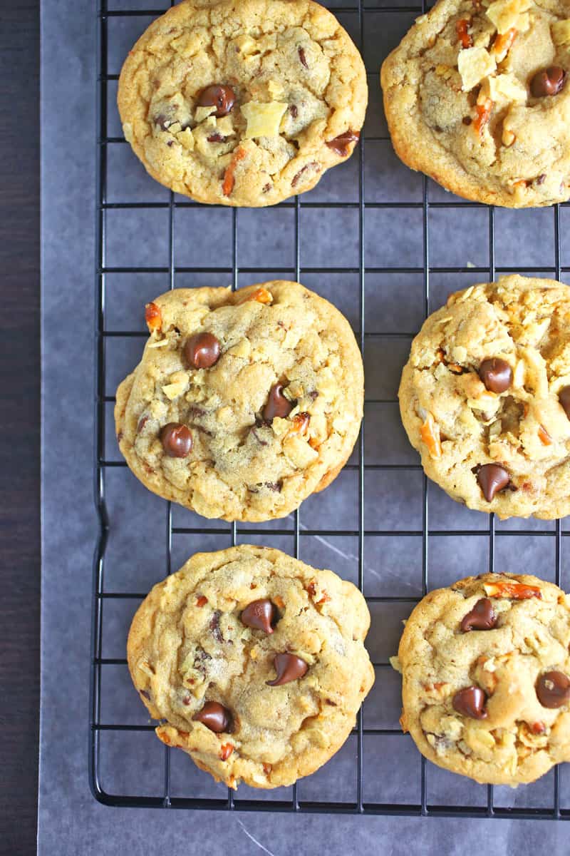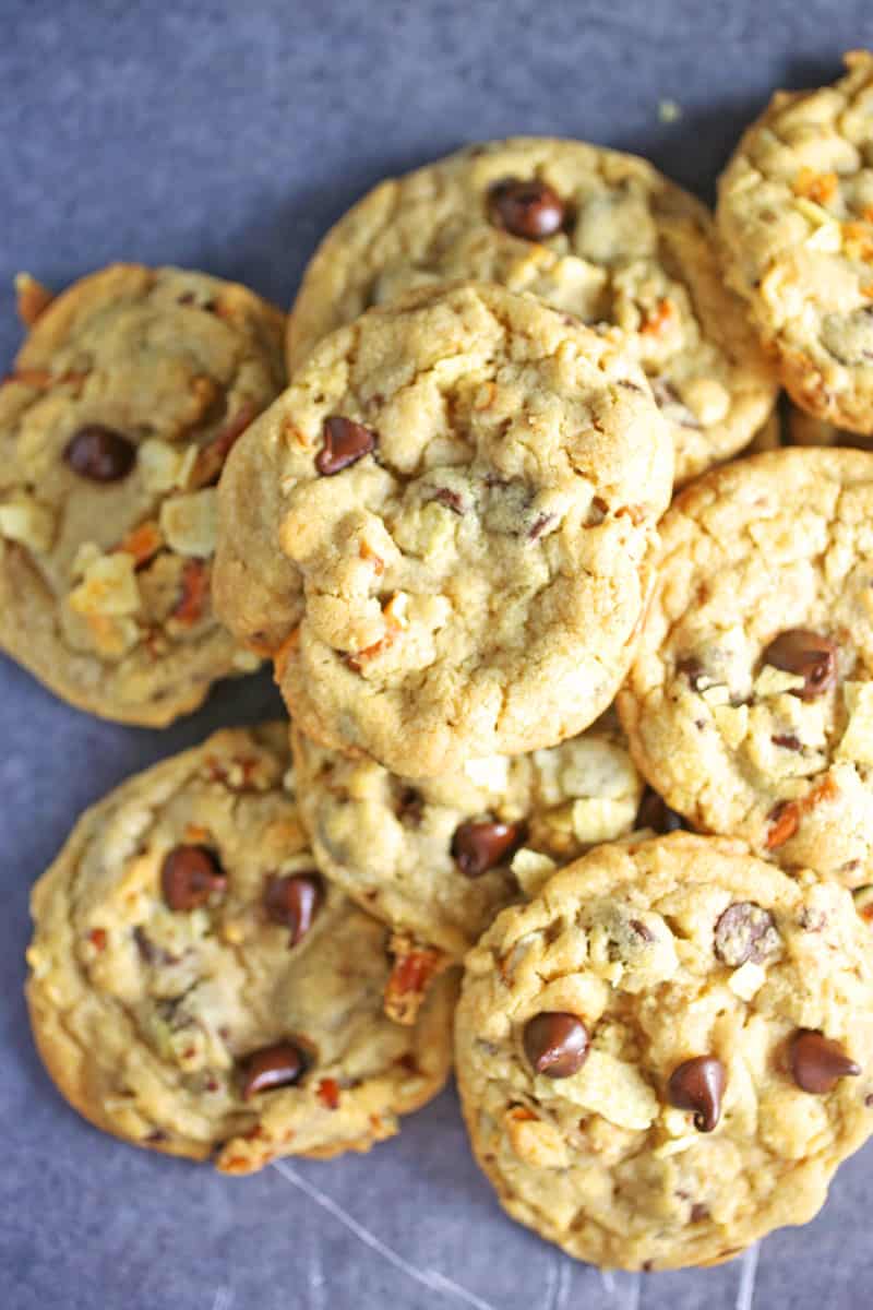 These Snack TIme Chocolate Chip Cookies are loaded with chocolate chips, crushed potato chips, and crushed pretzels.