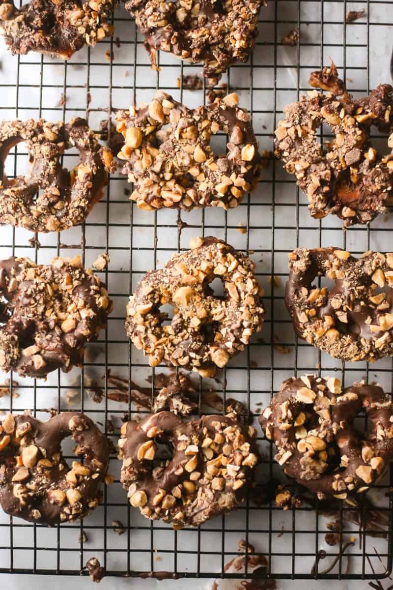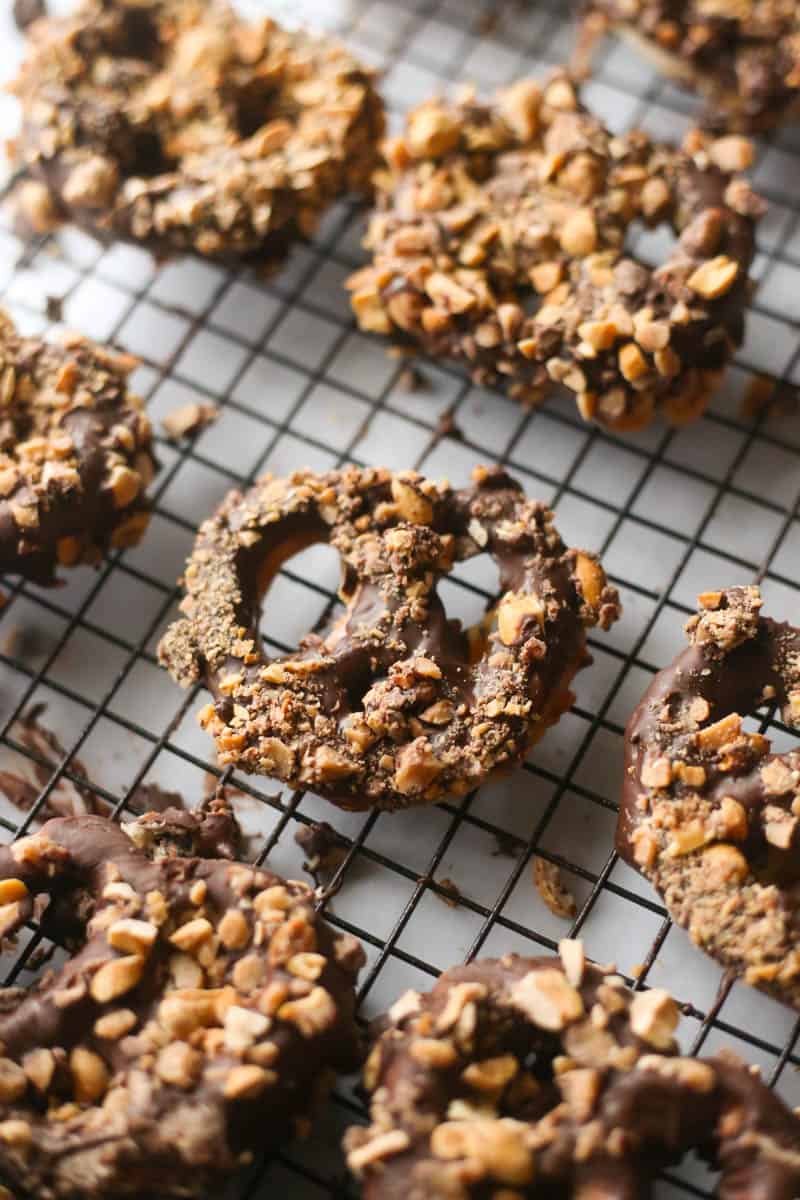 - Finally, dip in the chocolate and roll the pretzel into the peanut and toffee and place back onto the cooling rack. Allow to cool completely for 25-30 minutes before eating.