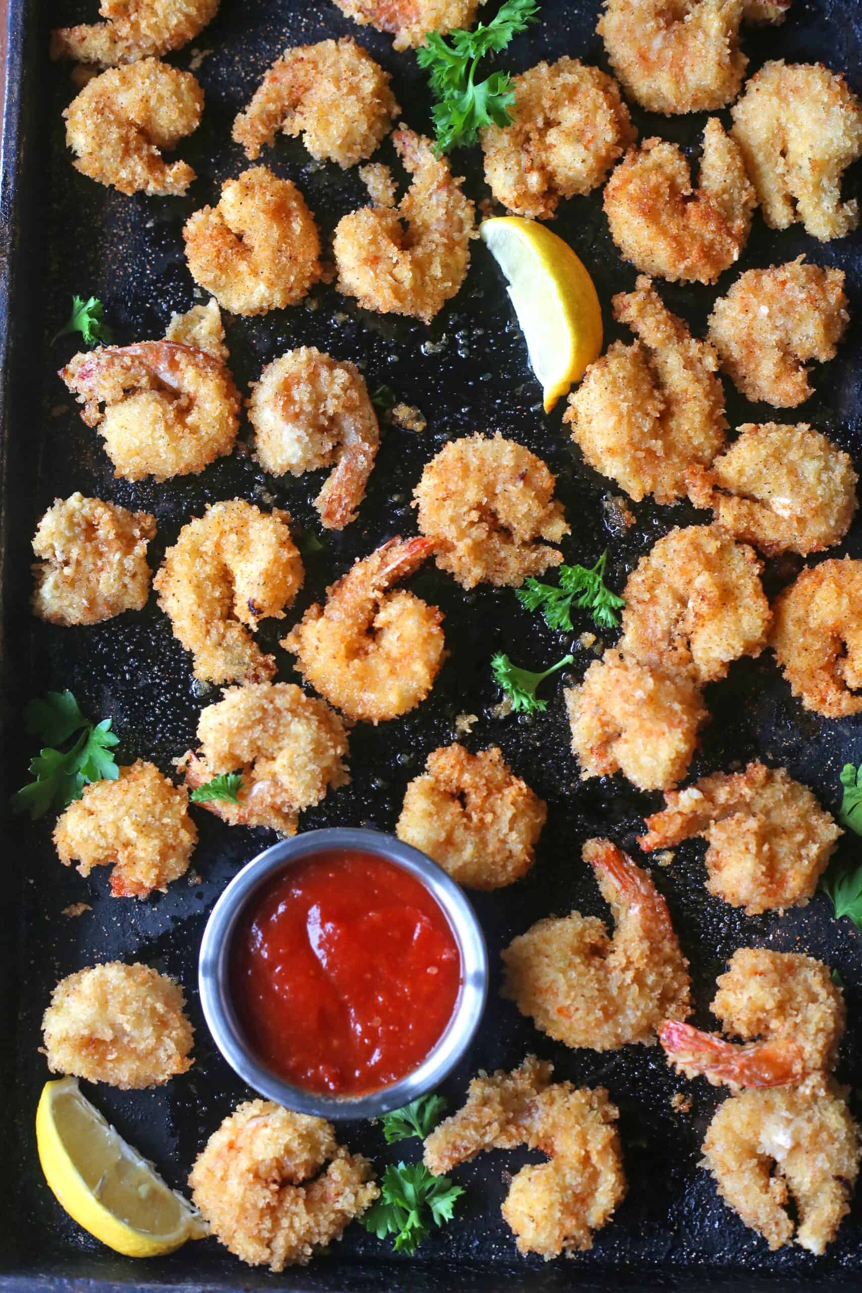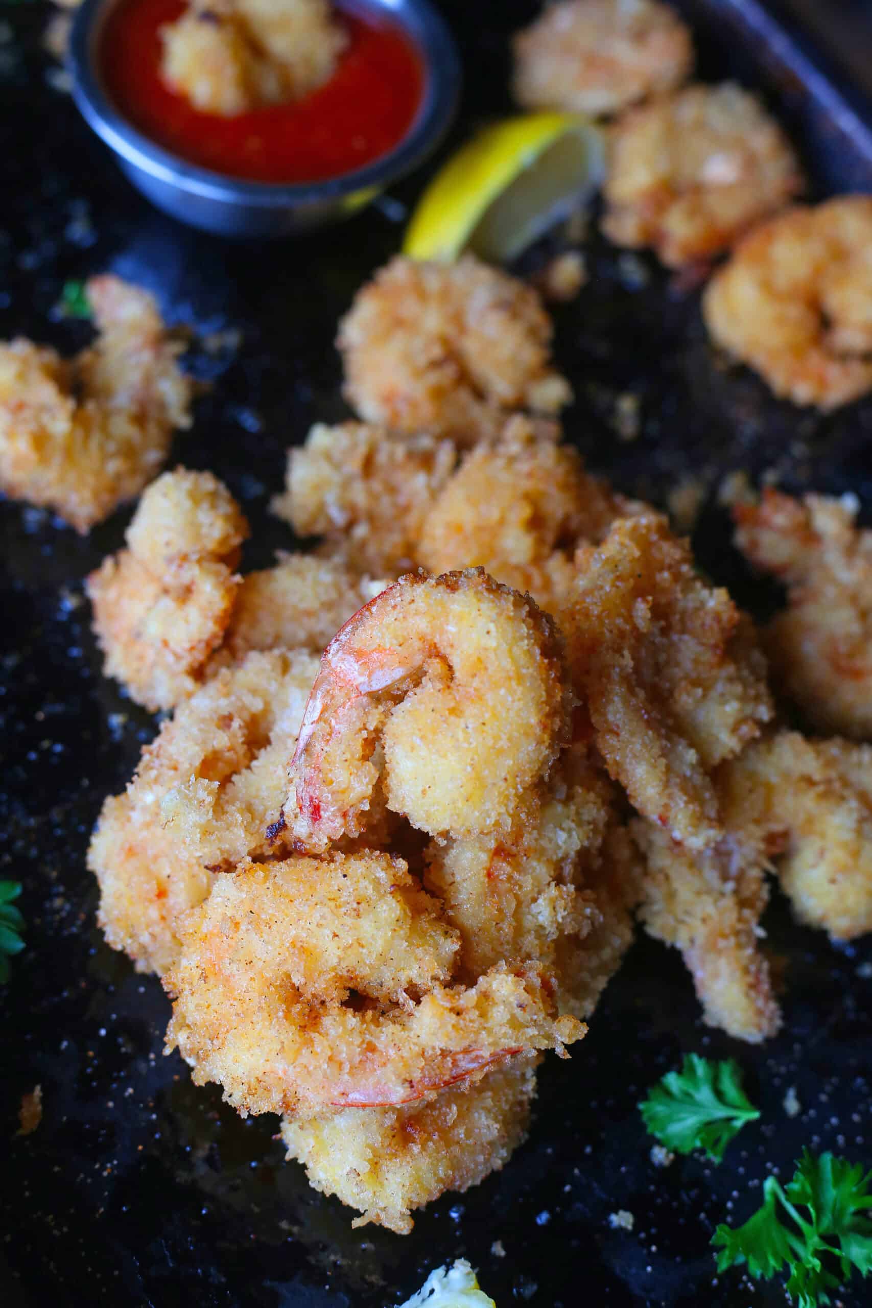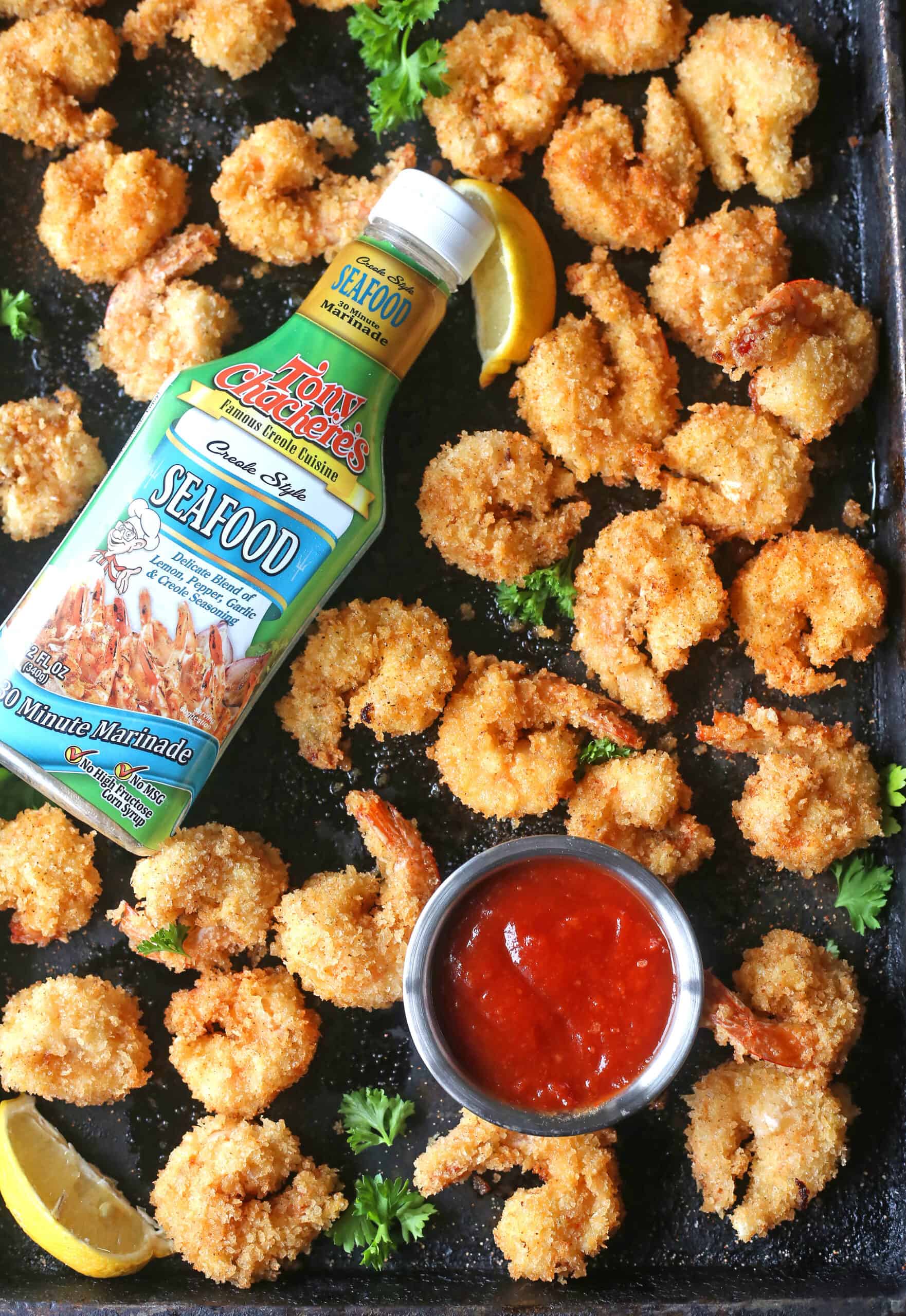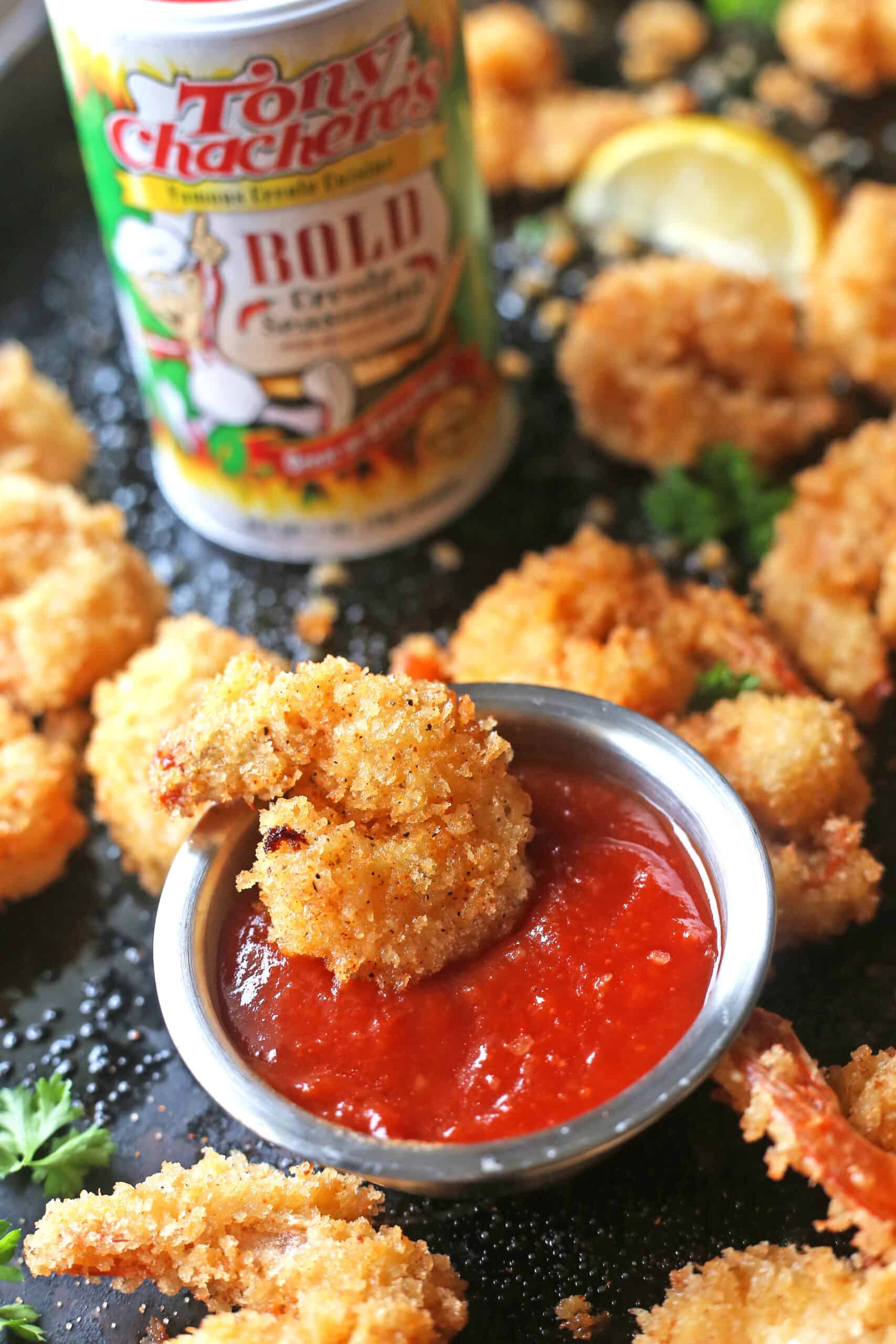 When it comes to making this Spicy Crispy Fried Shrimp Recipe, you are going to set up a dipping station with flour, egg wash, and panko bread crumbs. You’ll add seasoning and spices like garlic and onion powder, salt, pepper, and cayenne (of course). But the real winner when it comes to flair is Tony’s Chachere Creole Seasoning.
