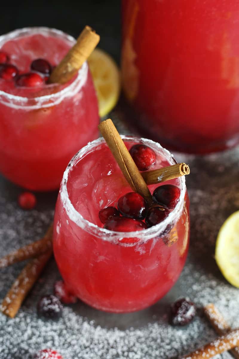 - Garnish: Powdered sugar around the rim for the winter effect; sugar cranberries on a toothpick on the side of the glass; and/or add cinnamon sticks to the glasses.