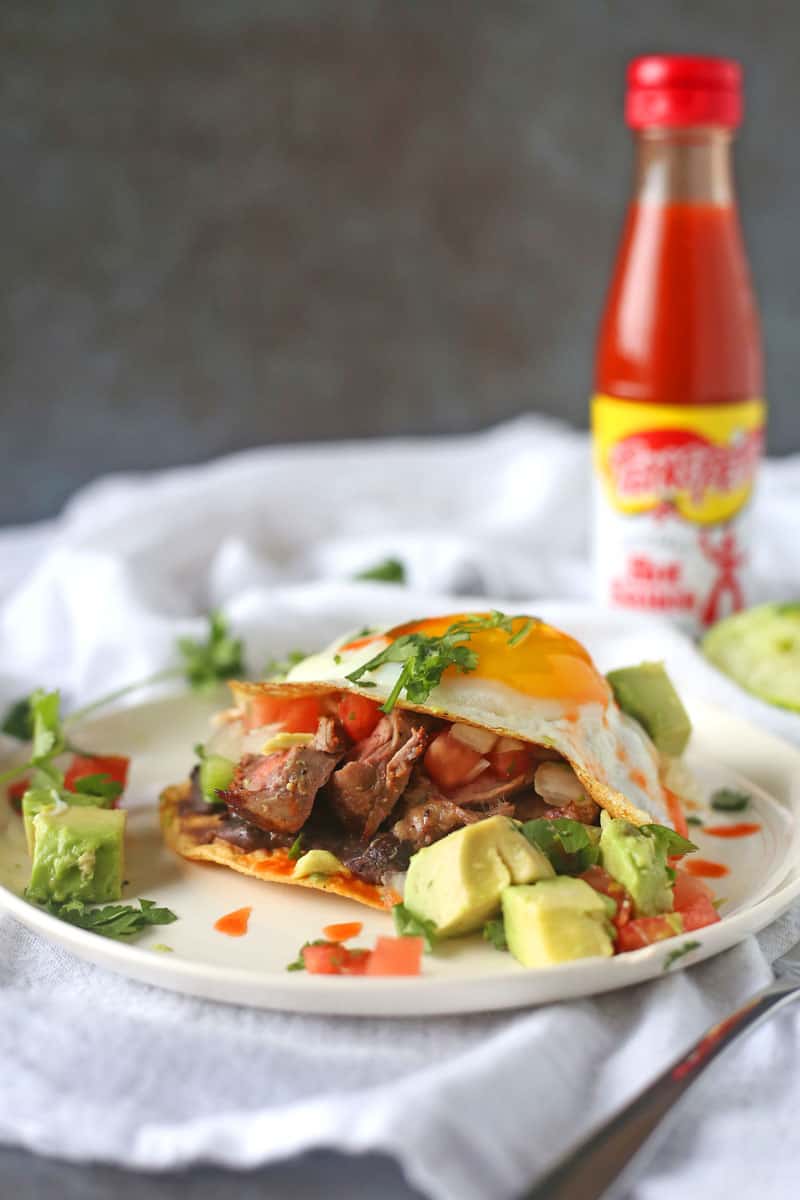 - Assemble the Huevos Rancheros by spreading the warm tostada with black beans, place 3-4 pieces of steak on top, add one of the fried eggs, top with pico de gallo or salsa, slices of avocado, and sprinkle with cilantro. For added flavor, add a dash of sriracha.