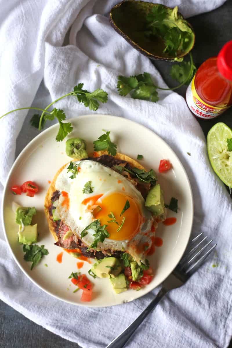 This Steak and Egg Huevos Rancheros recipe is the breakfast of champions. Made with a crisp tostada, black beans, steak, eggs, salsa, topped with cilantro and sriracha!