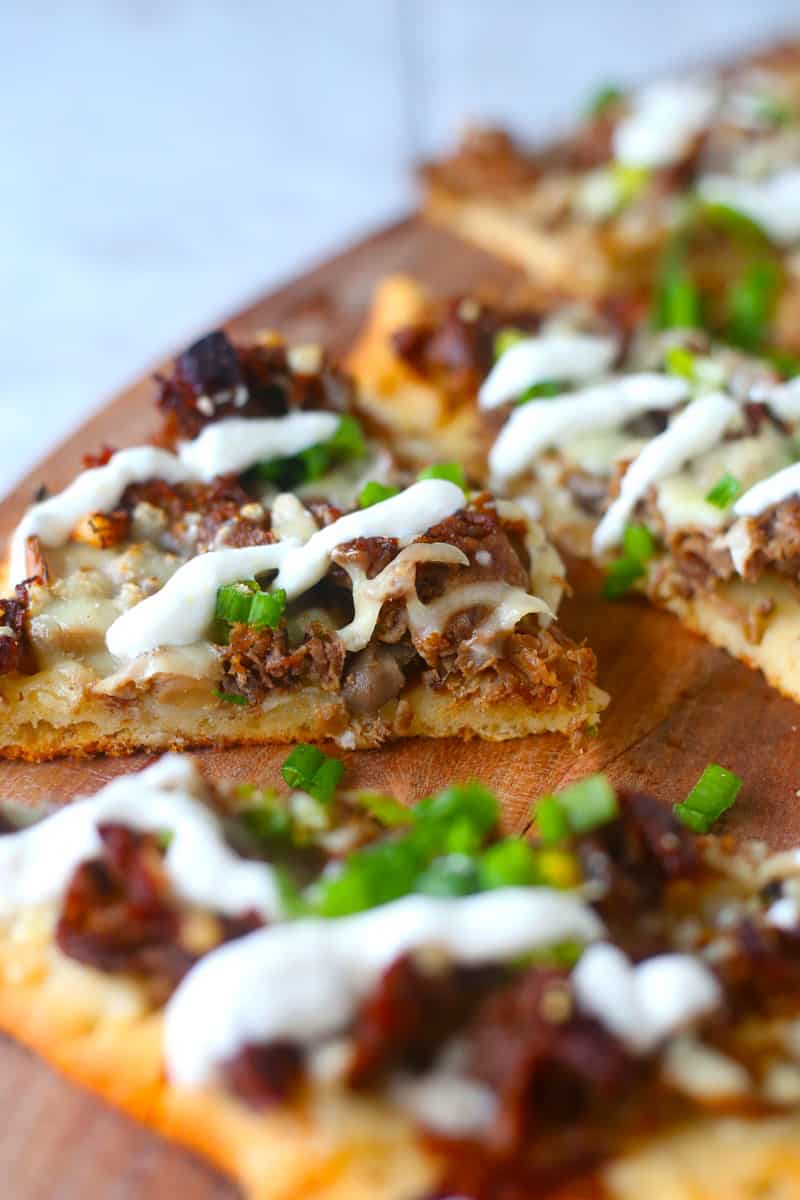 Enjoy this Steak and Mushroom Flatbread Pizza that can be served as an appetizer or a main entree. This pizza is topped with steak, mushrooms, Gruyere Cheese, and a creamy horseradish sauce!