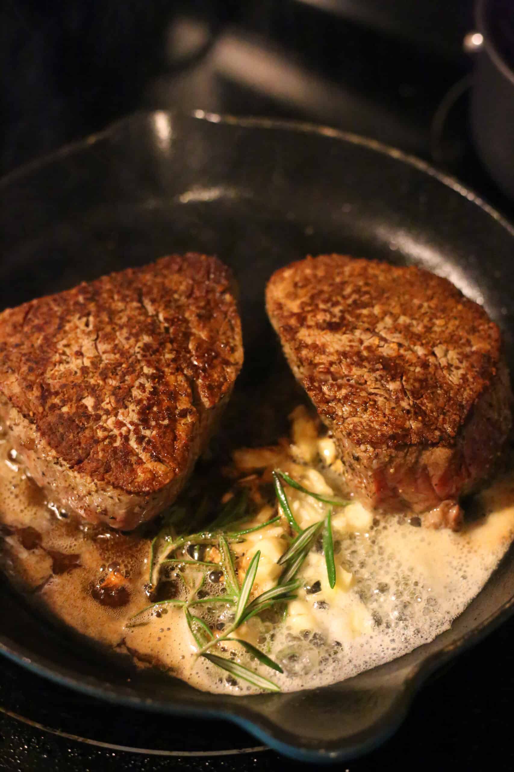 - Once removed from the oven, immediately add the butter spring of rosemary, and garlic cloves to the pan. Once the butter has melted, begin to baste the filets with spoons with the juice, butter, and garlic. Do this for about 3 minutes. Cover with aluminum foil and set aside.