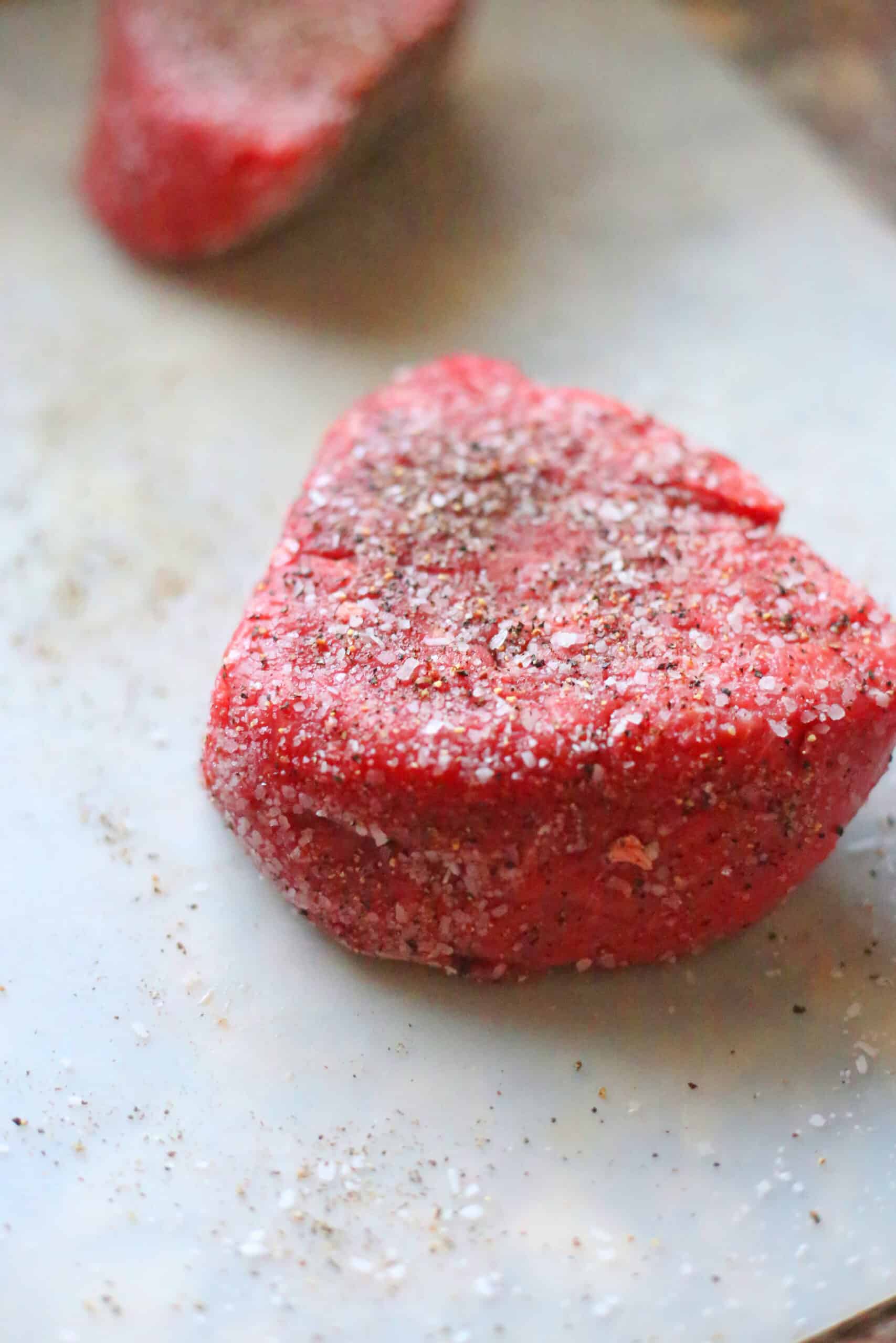 On both sides of the filet (any steak really), you season liberally with kosher salt and coarse pepper. Why do I keep mentioning kosher salt? Well, kosher salt is the perfect salt for beef. Table salt is too salty. If you were to taste food with table salt, kosher salt, sea salt, and Himalayan salt, although they all bring out the flavor of the food, they all have a different saltiness to them. With steaks, you really want to aim for a well seasoned cut of beef that, once seared, has a nice crust to it as well, which is where the salt and pepper comes in. I typically only use table salt for baking.