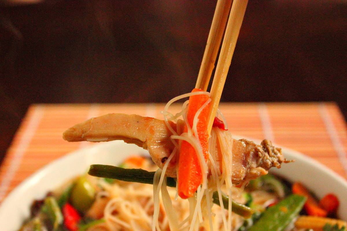 Chicken is stir-fried with a diverse mix of vegetables and seasonings. The mixture is then combined with broth and rice noodles for a satisfying meal.
