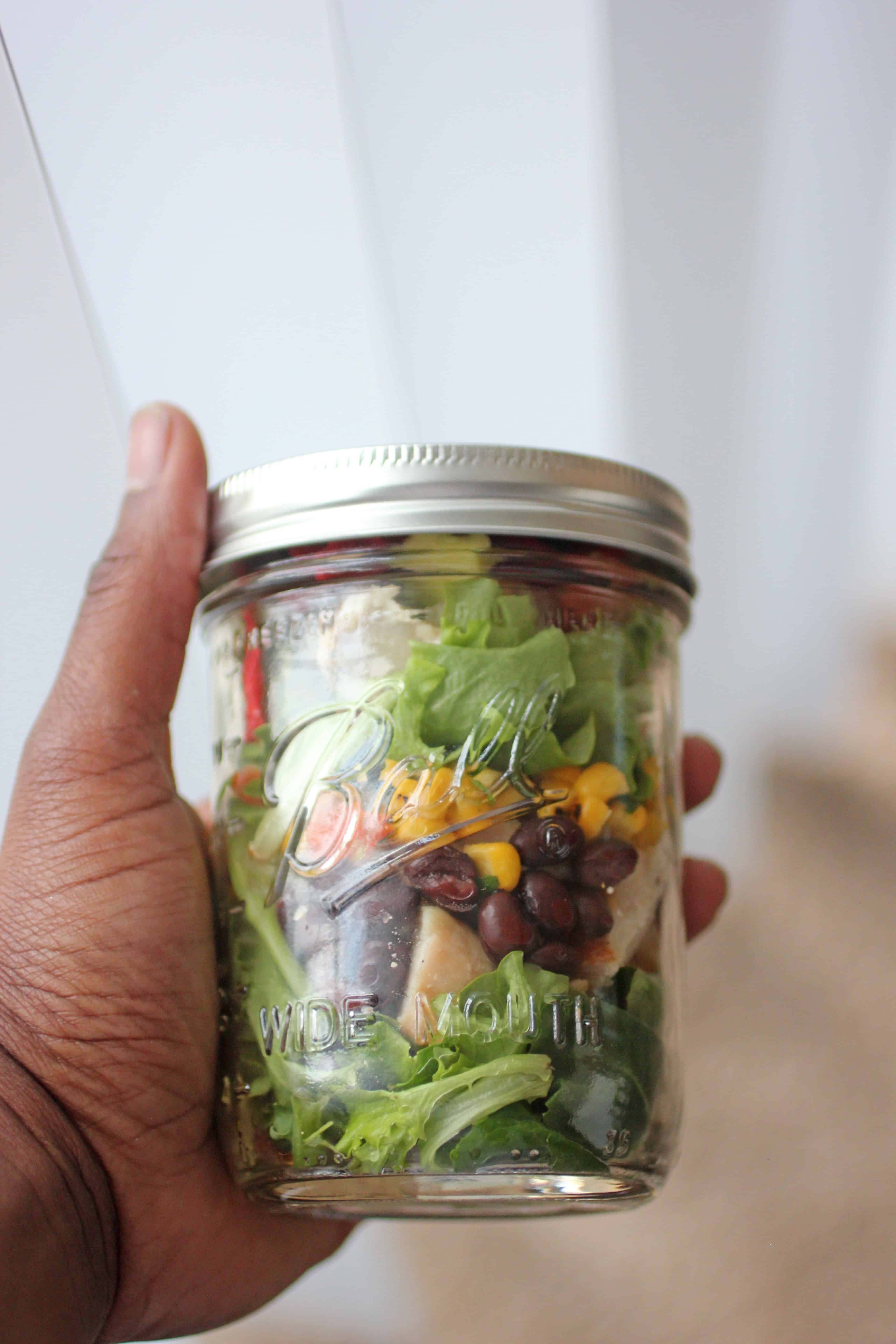 The idea is simple. Just use a 12-ounce Ball Mason Jar and layer with the ingredients! For the salad recipes you can just add your preferred salad dressing and add to the jar and shake for an even coating.