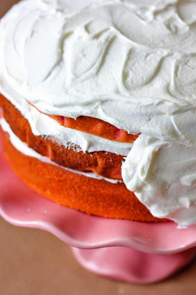 - Take the last layer and place bottom side up (so the top of the cake will be even) and frost the top of the cake. Take the rest of the frosting and frost the outside of the cake until completely covered. I recommend placing in the refrigerator for 15 minutes to let the frosting set a little and then serve.