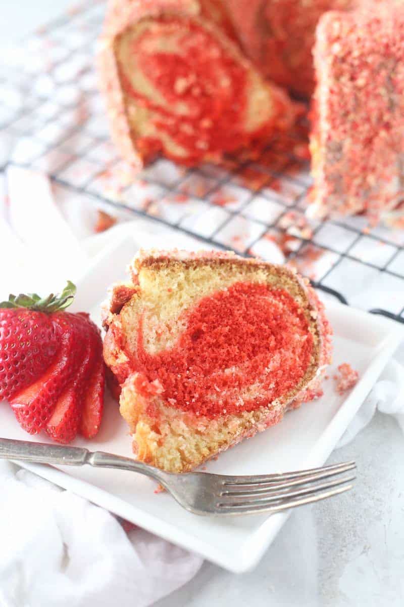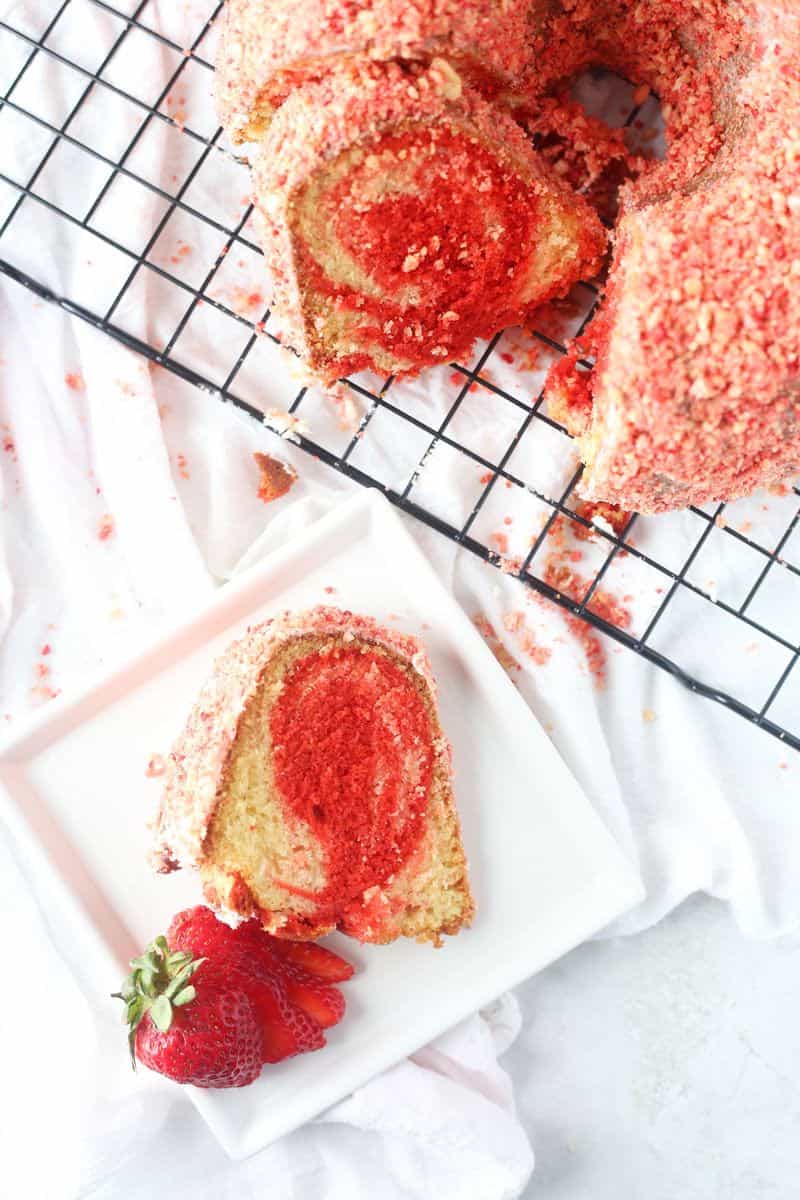 Enjoy this Strawberry Crunch Cake that is a Strawberry Swirl Cake coated in a delicious and crumbly topping made With cookies and feeze-dried strawberries!