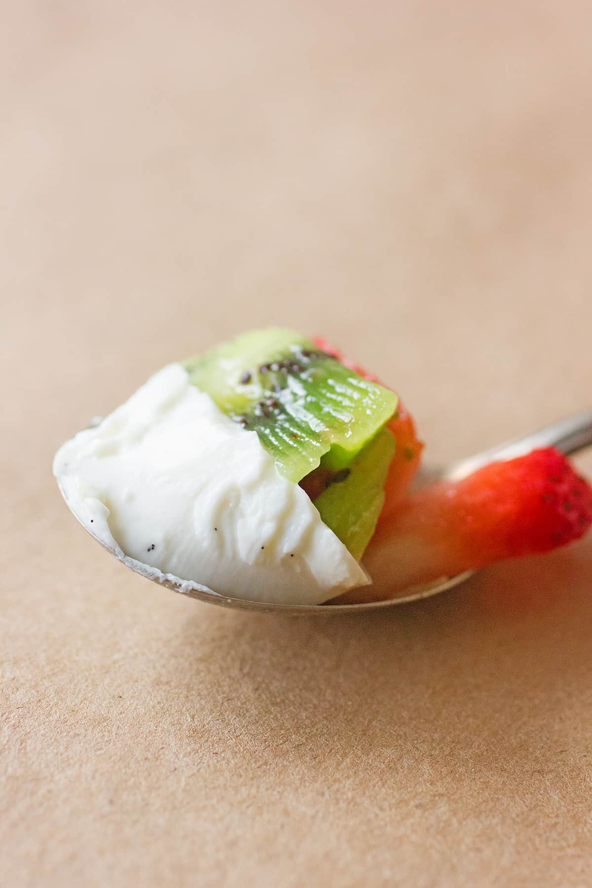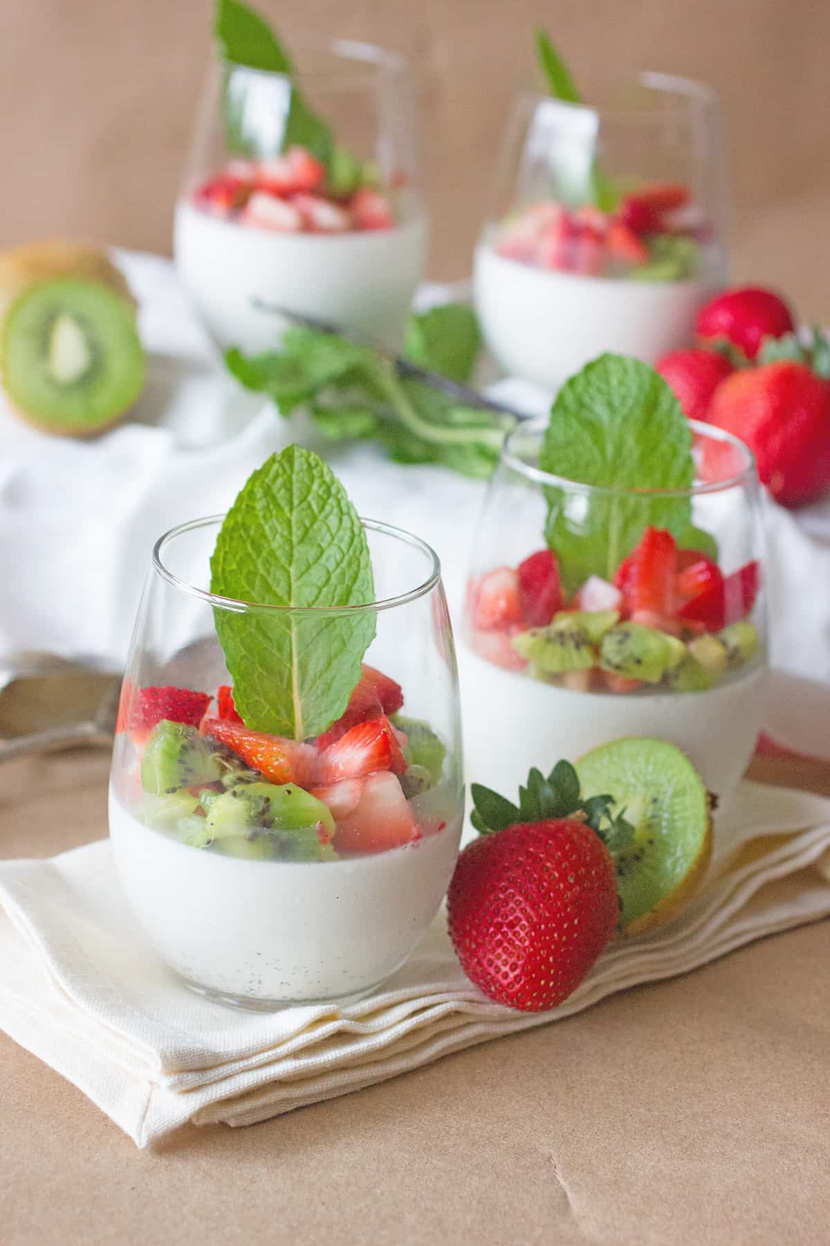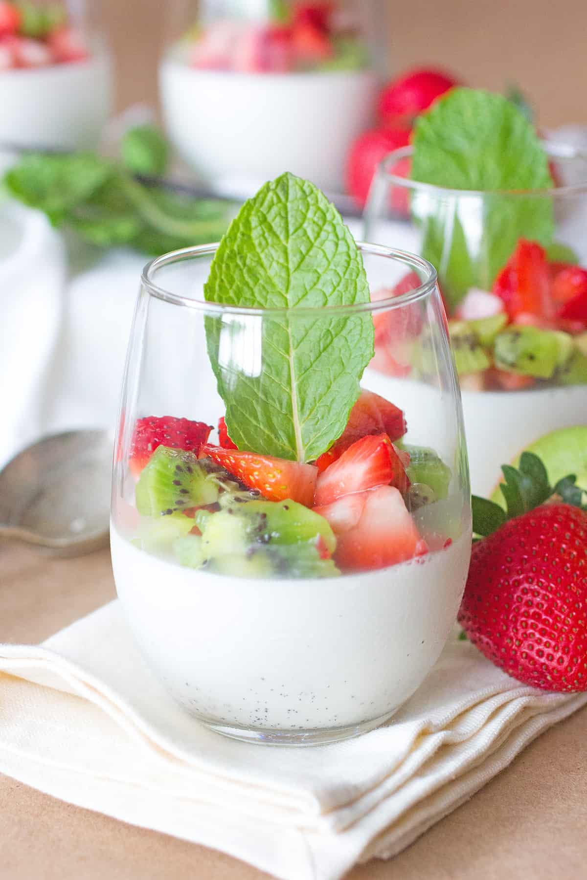 - Toss the strawberries and kiwi together in a bowl and once the Panna Cotta has chilled, spoon some of the fruit on top of the dessert and serve. Garnish with mint leaf if desired.