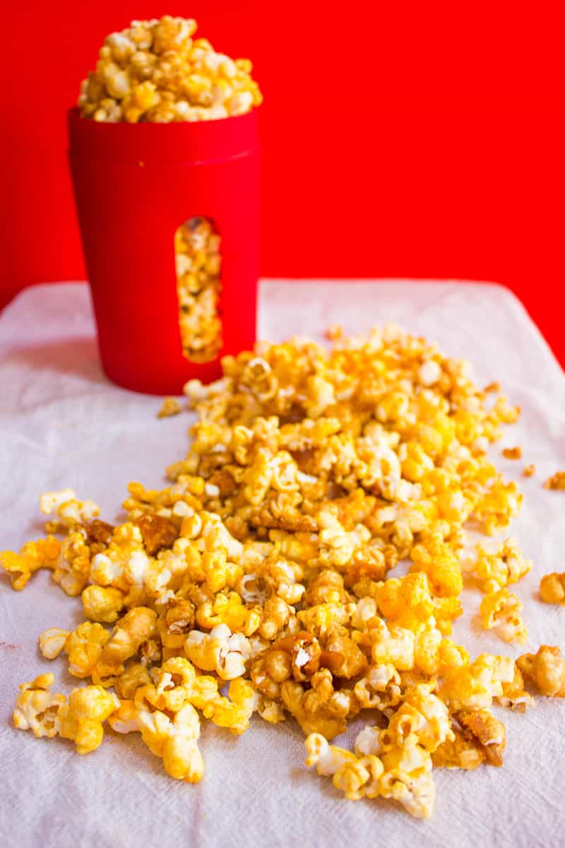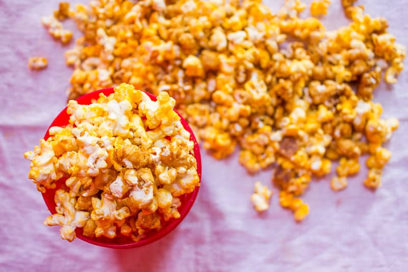 - Line a baking sheet with parchment paper and pour the caramel popcorn on top of the baking sheet. Spread it evenly across the parchment paper and place it in the preheated oven for an hour. Once finished baking, remove pan from oven and set aside to allow to cool. Once it’s finished cooling, break apart the popcorn and add it into the cheddar popcorn and toss. Place in an airtight container until ready to eat.