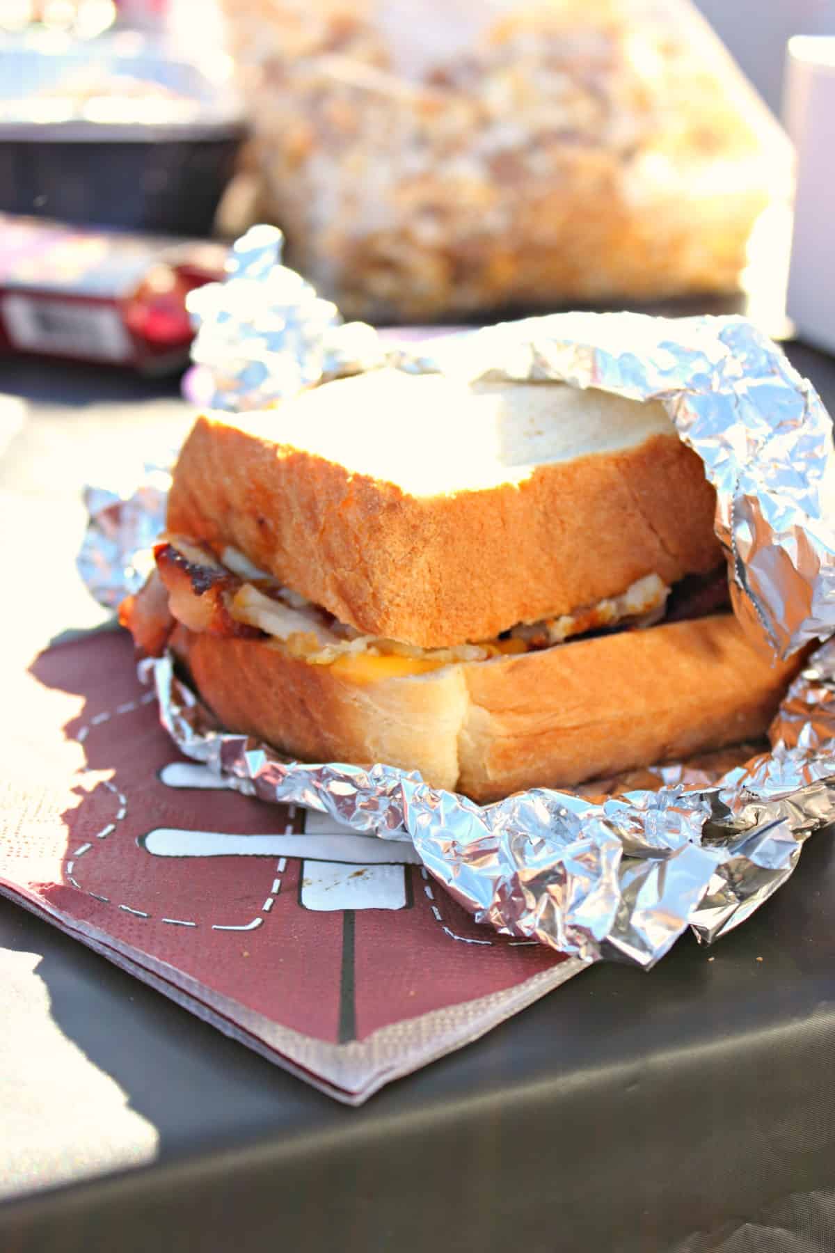 - Then when you are at your tailgating event, heat your grill to medium heat. When your grill is ready, place the sandwiches wrapped in the aluminum foil on the grill and allow to cook on both sides for 5-10 minutes to allow the bread to get toasty and the cheese to melt.