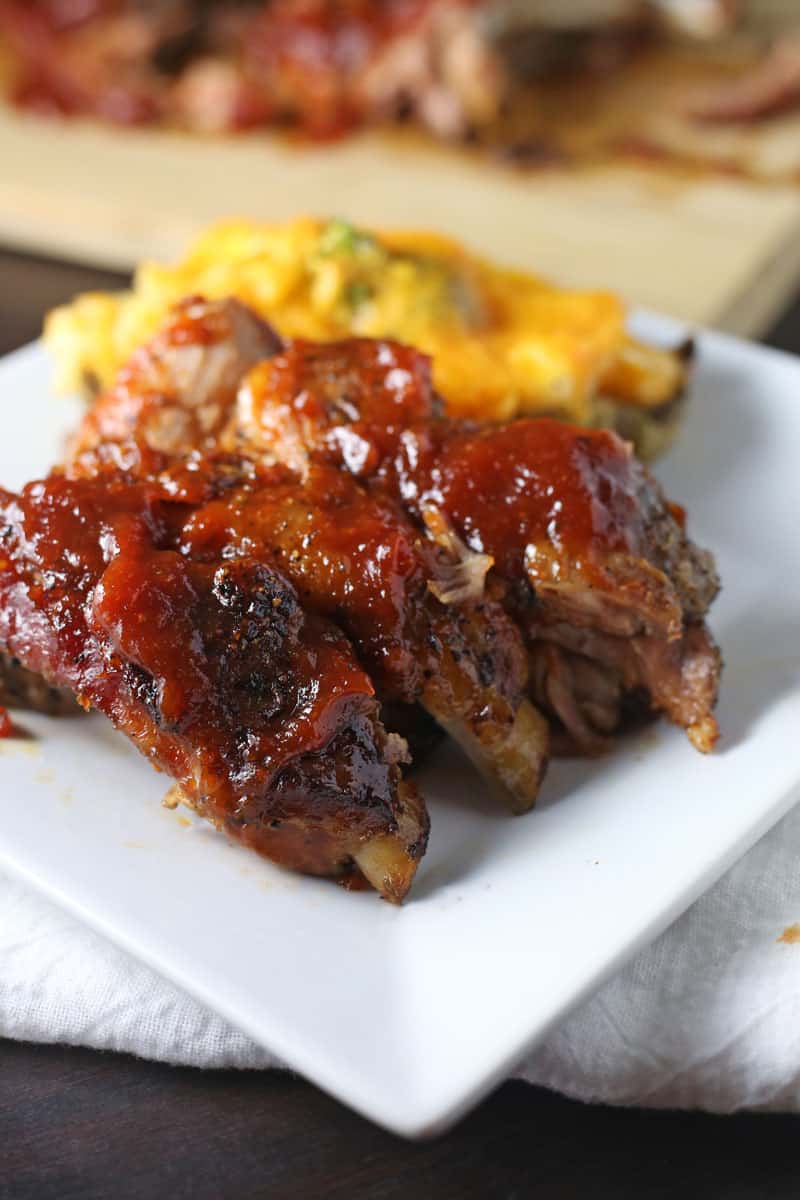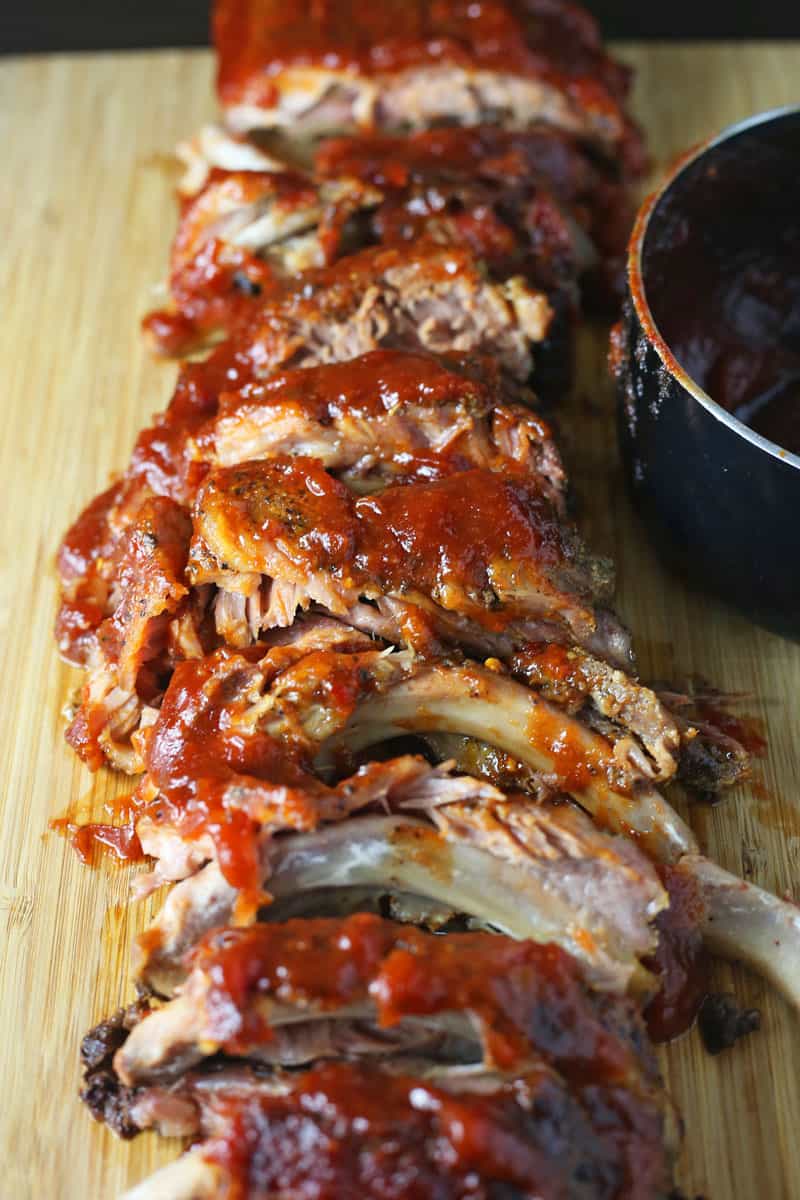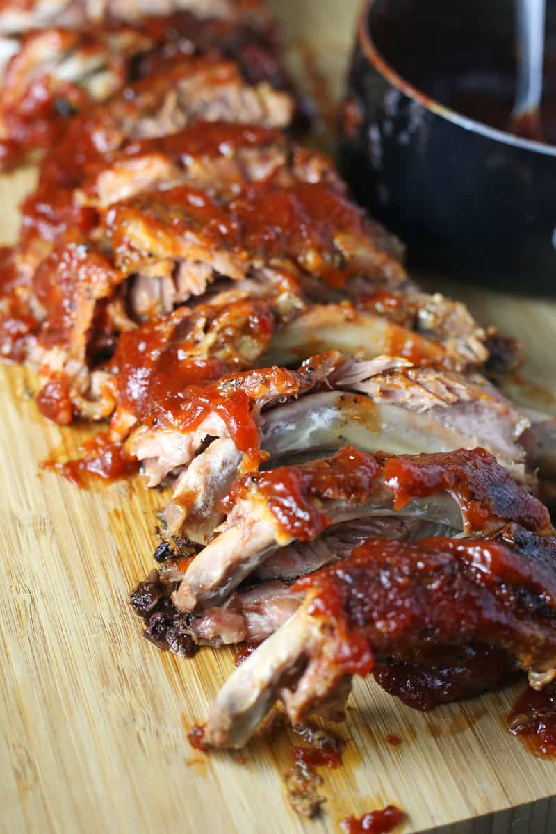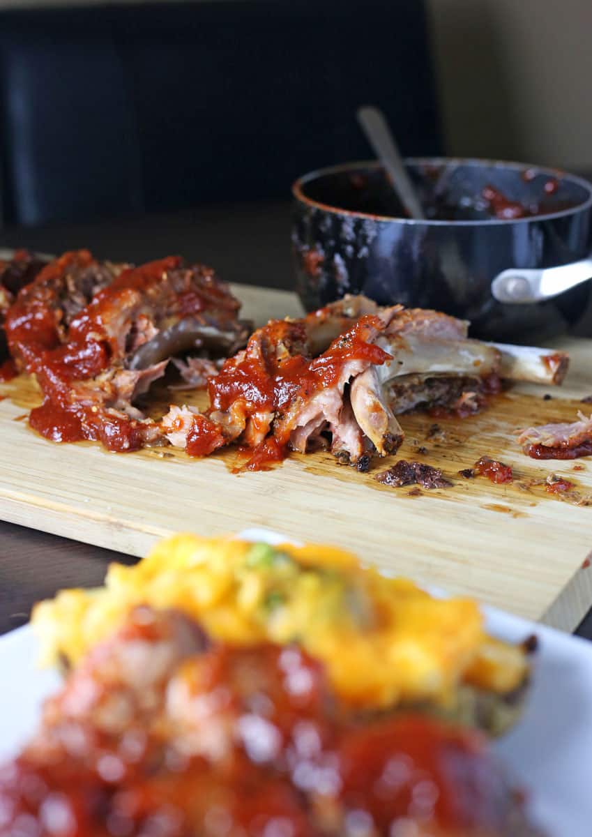 To my wonderful surprise, after 8 hours of cooking in the crockpot on low heat and using common and simple seasonings and spices, I had the extreme pleasure of tasting some of the most amazing ribs I have ever tasted in my life. I mean that in all seriousness. These Crockpot Pork Ribs taste like how ribs are supposed to taste. Flavorful, juicy, and tender. In fact, I had a problem when it came time to take pictures of these ribs. It was actually a good problem if I must say so myself. The meat from the pork ribs kept falling off the bone! It was so hard to get the ribs out of the crockpot so I can take pictures of them. I had to use a few utensils to keep them whole as I placed them on the cutting board. Don’t even get me started on my homemade Apple Barbecue Sauce. All I can say is that I need to bottle this stuff and sell it in the store. I love the sweet, salty, and tangy flavor elements that you get from this barbecue sauce. Because apples go so well with pork, I decided to make an apple based barbecue sauce. I added some applesauce and apple cider vinegar to a basic barbecue sauce base to cover the ribs. I was eating and taking pictures at the same time. In fact, I had to stop myself otherwise I would’ve eaten my subject for my pictures.