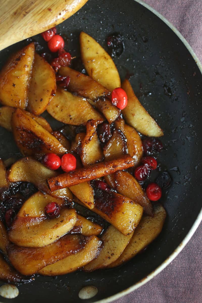 - In the same pan, melt the butter. Add the sliced Gala apples, cinnamon stick, and cook for about 5-7 minutes. Long enough for the apples to begin to soften. Add the whole cranberries and brown sugar and toss to coat the apples. Add the apple cider vinegar and continue to cook long enough for the cranberries to pop open, about 5 minutes. Remove from heat and top the pork loin with the apple topping and serve.