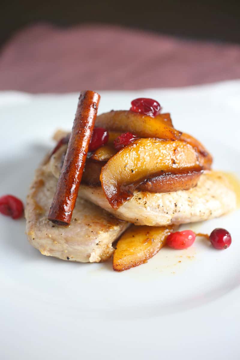 Pretty much for the last 3 months of the year, we put more crap in our bodies than we care to admit. Starting with the football parties, to the Halloween candy, to the Thanksgiving Leftovers, and the Christmas Cookies. We are bound to gain a few pounds. Unless you are not a fun person and actually eat healthy at this time. If you are one of those people, I hate you (I’m really jealous of your discipline). Saying all of that, this dish is actually pretty healthy and lean. The Pan Fried Pork Chops are cooked in a bit of olive oil and the topping gets most of its sweetness from the apples. The great thing about this pork recipe is that although it is lean, you really won’t feel that you are eating healthy simply due to the flavor. This Pan Fried Pork Chop recipe is perfect as a main dish for your holiday dinner if you want a lighter and leaner option. Not to mention you don’t have to wait hours for a turkey or roast. This entire dish can be made in 30 minutes! So, if you are looking for a lean and healthy option for the holidays and you want something packed with winter flavors, try this recipe of Pan Fried Pork Chops with Apple and Cranberry Topping.