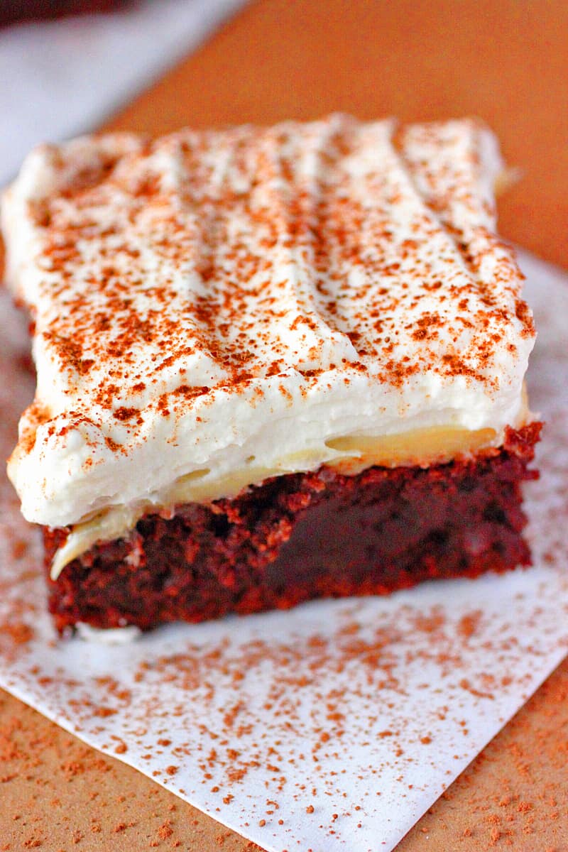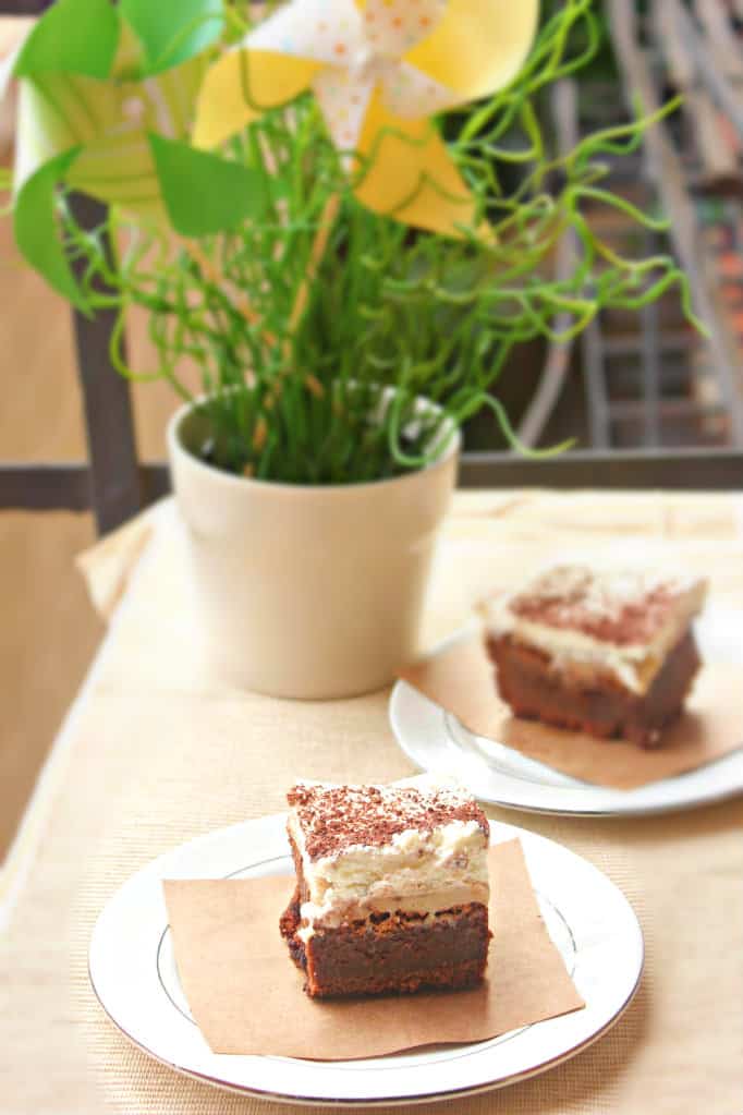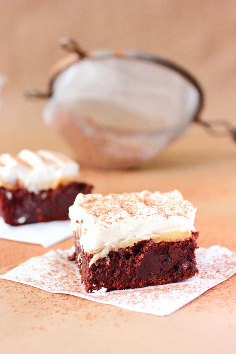 - Spread the mascarpone whipped cream on top of the cooled brownies and dust with cocoa powder (optional).