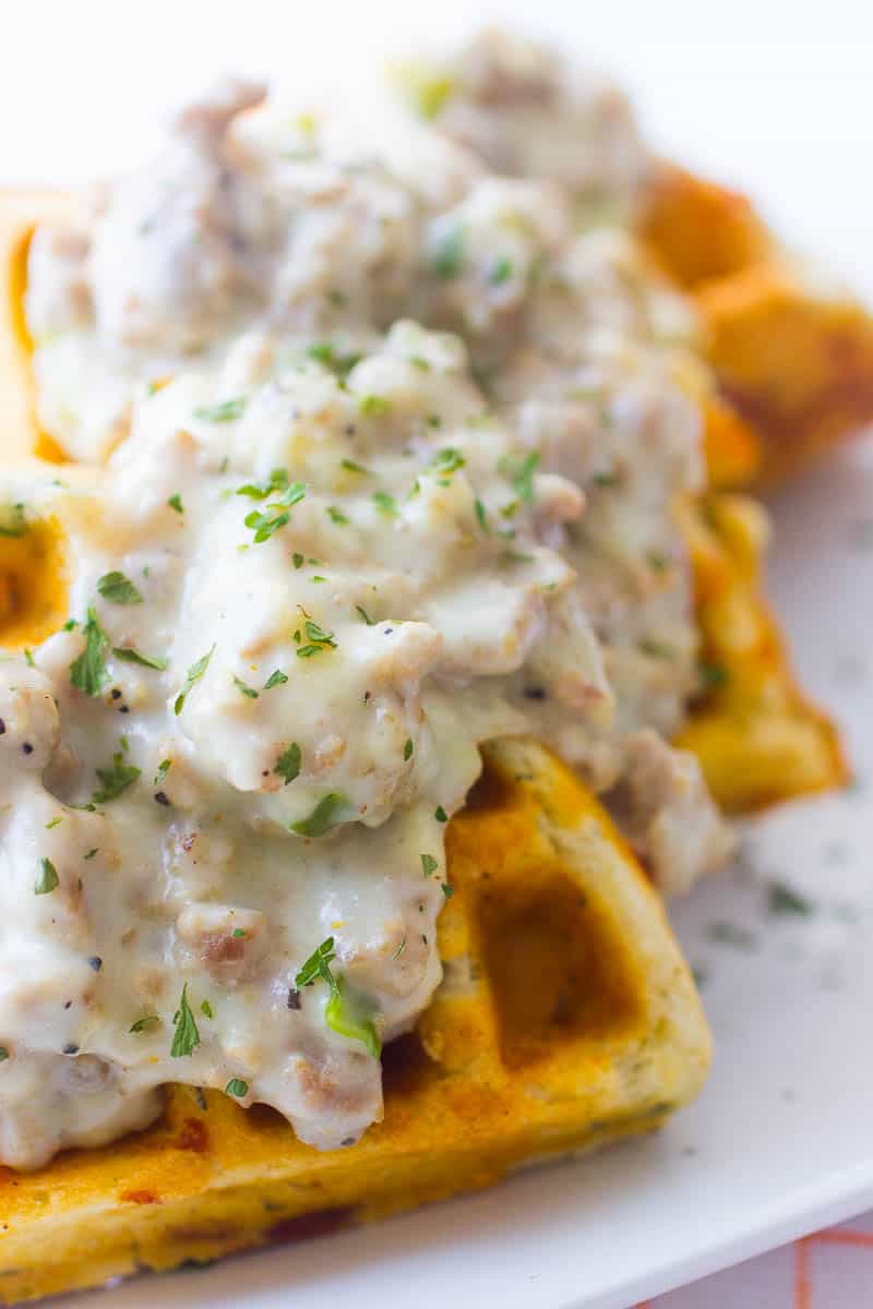 - Serve the gravy on top of the waffle biscuit and enjoy!