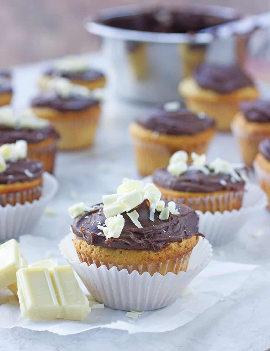 Enjoy these White & Black Cupcakes with a White Chocolate Cupcakes and rich Milk Chocolate Frosting. Make these for your next major event!