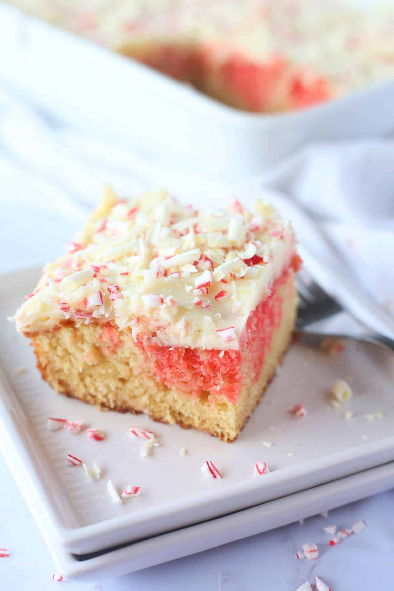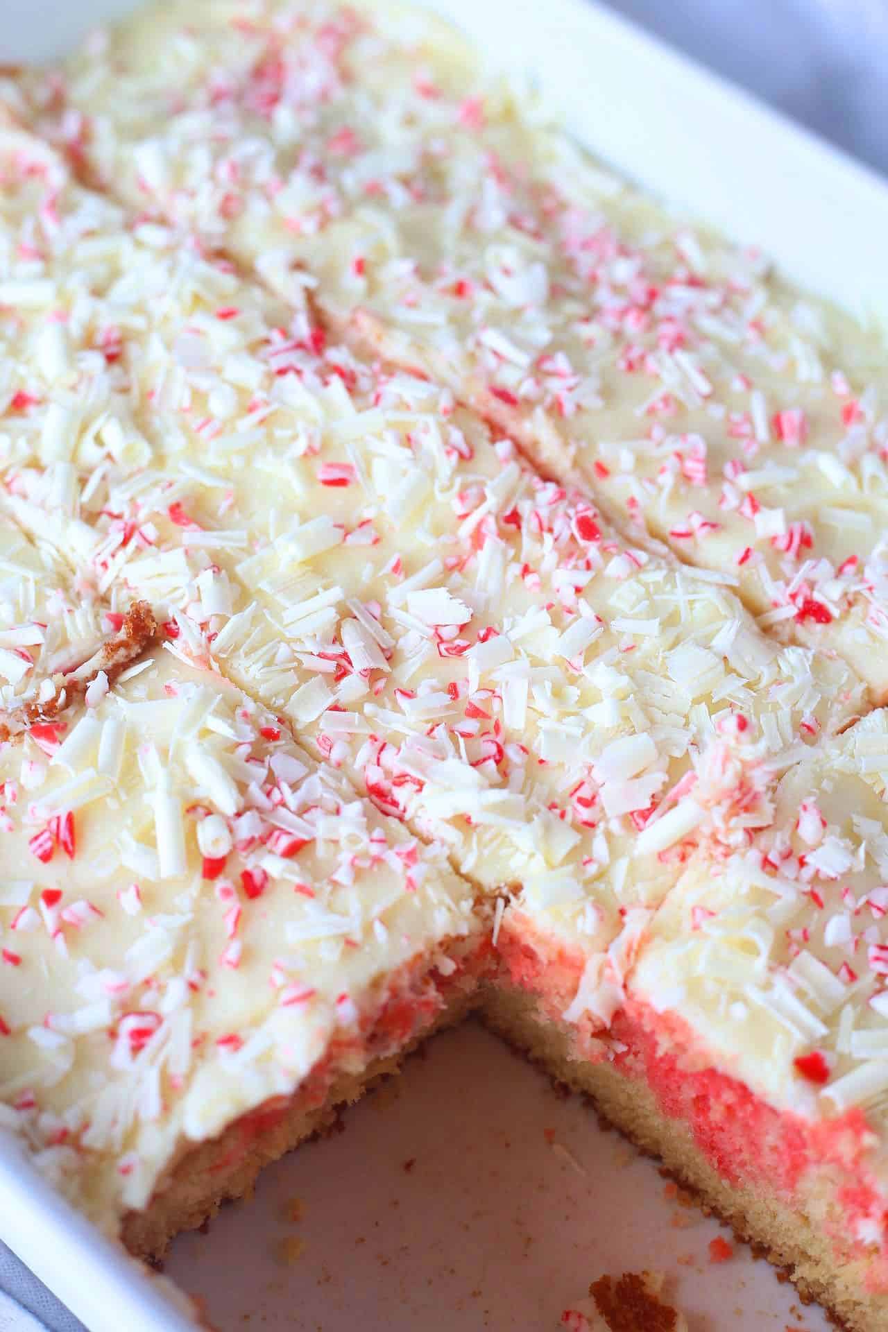 Start your holiday baking journey with this White Chocolate and Peppermint Sheet Cake. This cake is topped off with a delectable white chocolate ganache frosting that is to die for!
