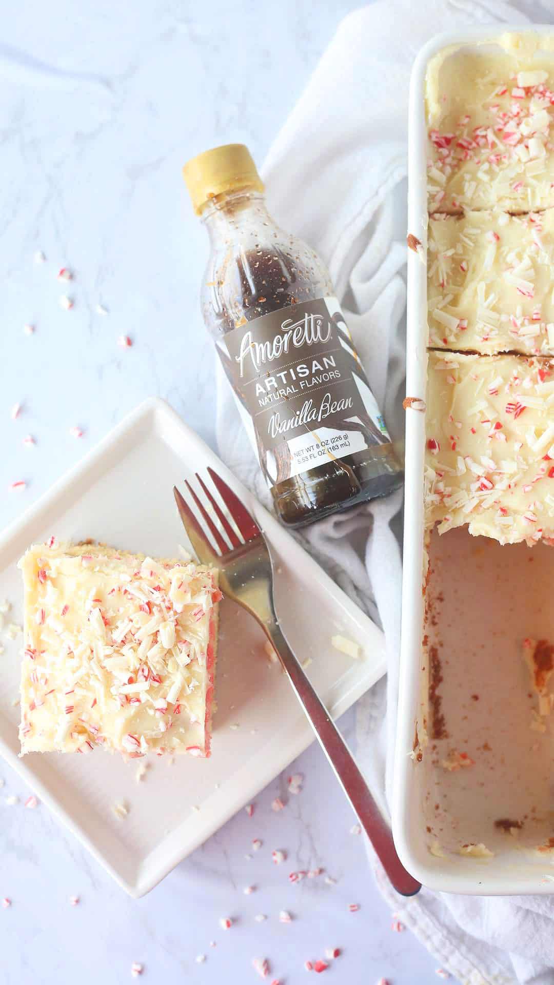 Recently I have discovered a new secret ingredient that is sure to take everything I bake to another level. Since the fall baking season began, I’ve been using enhanced flavorings by Amoretti. Amoretti has a full catalog of natural flavors that you can use in cake mixes and other baked goods that will take the flavor to another level, which is exactly what I did in this White Chocolate and peppermint Sheet Cake.